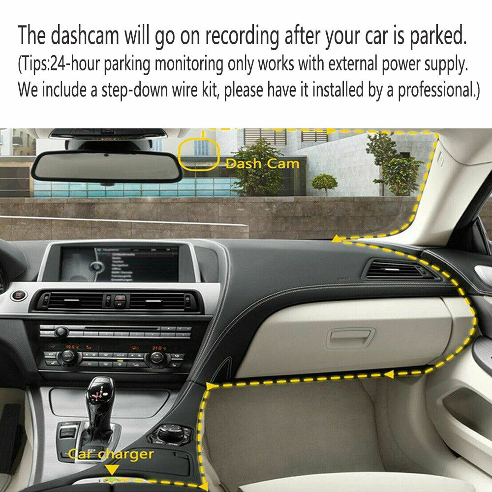 (Tips:24-hour parking monitoring only works with external power supply.We include a step-down wire kit, please have it installed by a professional.)