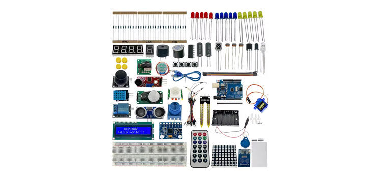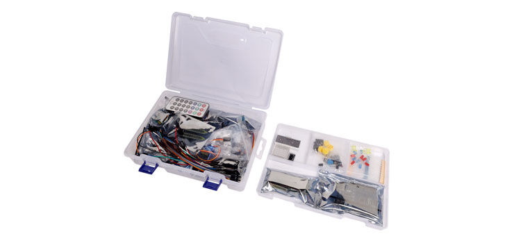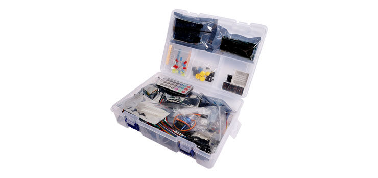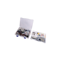 A handy parts kit containing everything you need to start learning Arduino and building projects. Includes a huge selection of sensor boards, LEDs, pots, jumper wires, a breadboard, LCD screen and much more! A handy storage case keeps it neat when youre finished building. Includes links to projects and example code.