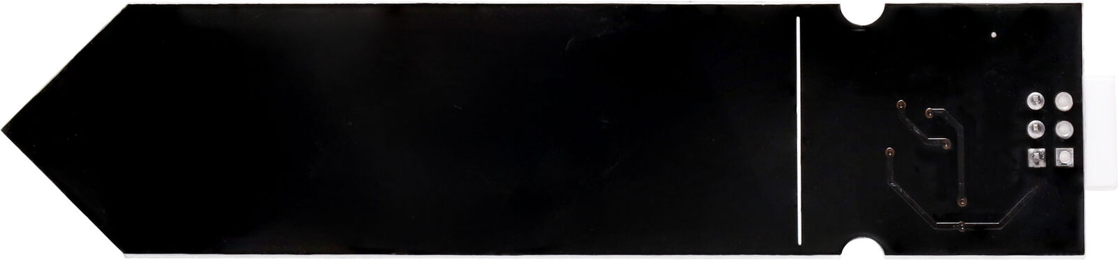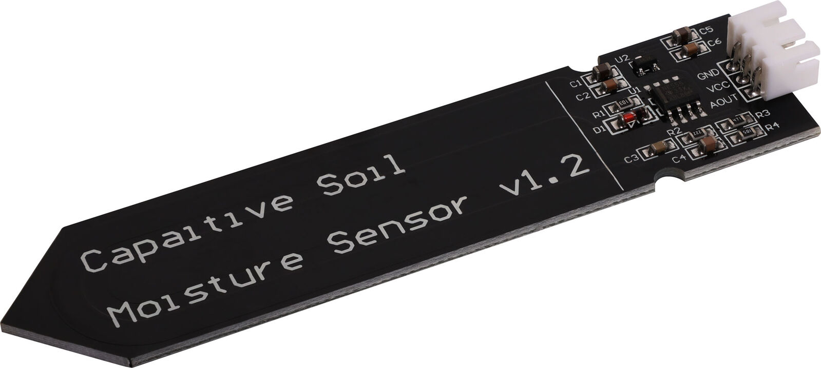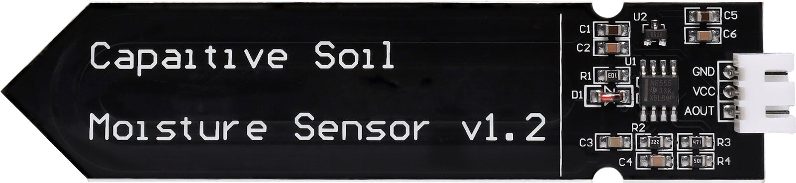 Detects soil humidity levels - a handy little sensor for building automated watering and retic systems. 3.3-5.5V input. Note: typical lifespan of about a year when left in soil permanently.
