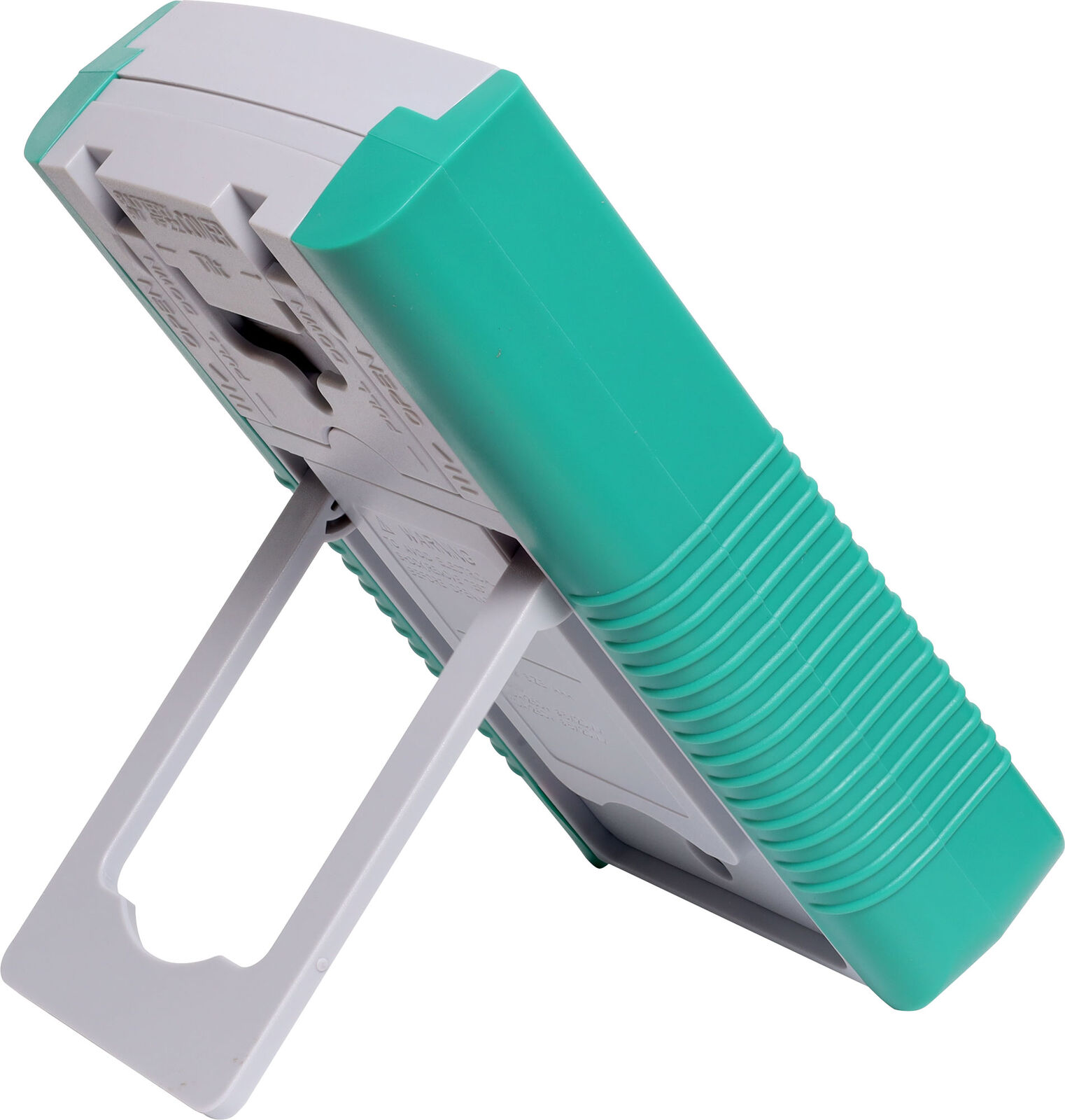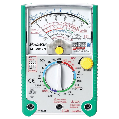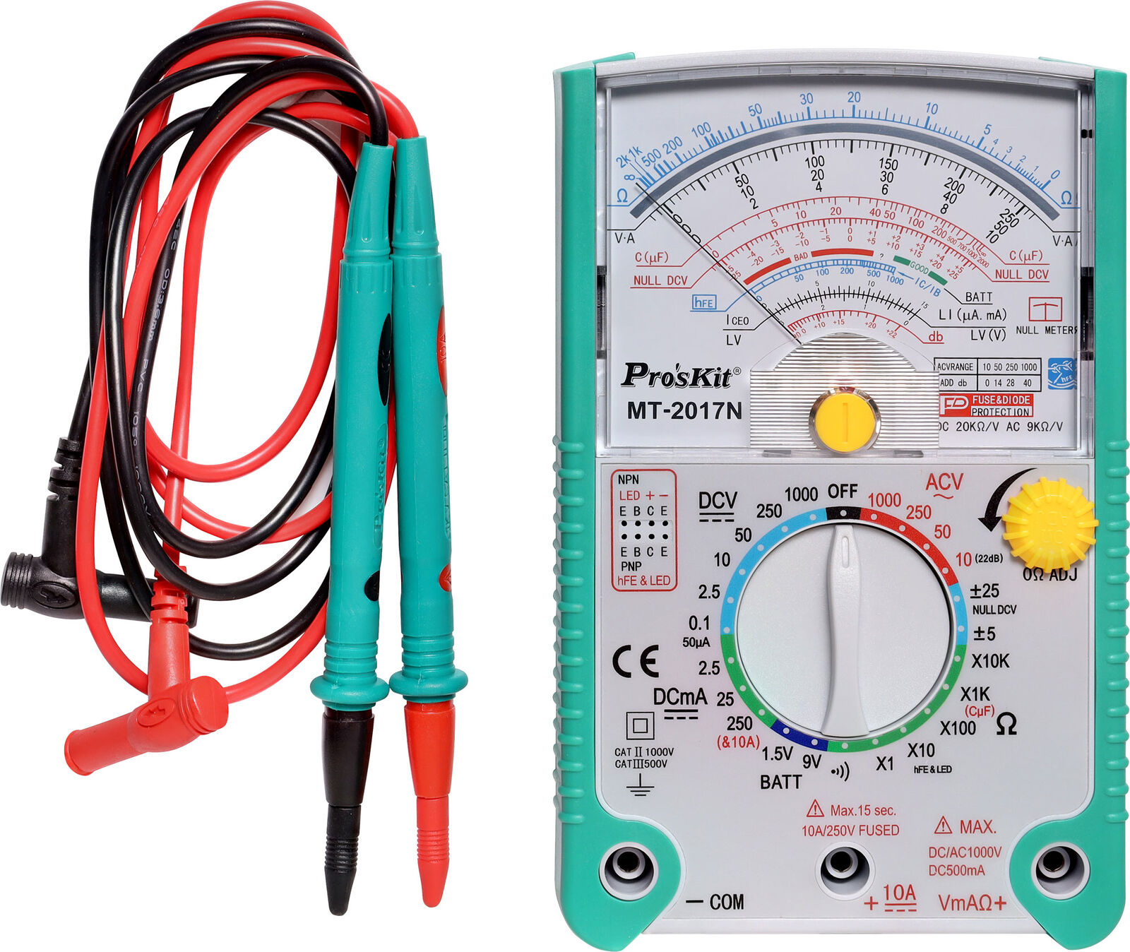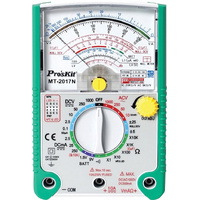 This quality analogue multimeter by ProsKit is ideal for observing constantly varying quantities such as cycling voltages or speaker resonance testing. This meter has 20kΩ/Volt sensitivity with a colour scale and mirrored arc for parallax error reduction. Includes audible continuity tester, battery test range, and up to 10A DC current measurement. Complete with integral stand, fuse and diode protection and test leads. Requires 2 x AAA batteries (sold separately).