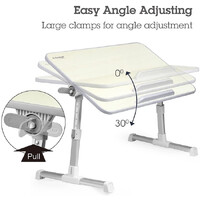 You can easily enable quick height changes (adjustable from 9.4"-12.6" 24-32cm) on this table using two auto-lock buttons on each side. In addition, you can also adjust the surface angle from 0-30 degrees by pulling a lockbutton and releasing it when you get the desired angle.