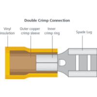 A double crimp features two crimping surfaces. Firstly, an inner crimping ring which is directly attached to the spade lug, this crimps to the exposed cable core. Secondly the outer crimping ring secures both the cable core and outer sheath to the crimp terminal. This results is a vastly more reliable connection.