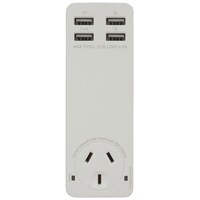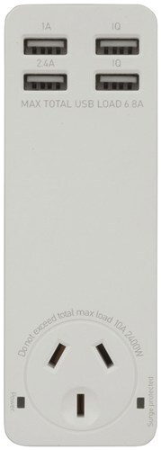This mains power socket enables you to charge up to four USB powered devices simultaneously (6.8A shared), with a pass-through mains socket allowing you to connect an additional mains powered device. Two USB ports (USB 1 & 2) feature smart IQ technology that can auto-detect a connected iOS® or Android device and charge it with the optimum charging current. USB port 3 provides up to 2.4A output to charge tablets and iPads, and USB port 4 provides up to 1A for Smartphones and smaller USB powered gadgets. Safety features include surge protection, over-current, over-voltage, over-temperature, and short-circuit protection. Power status LED indicator. SAA approved. Specifications