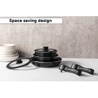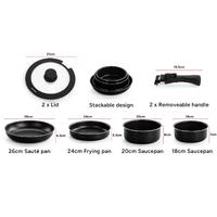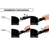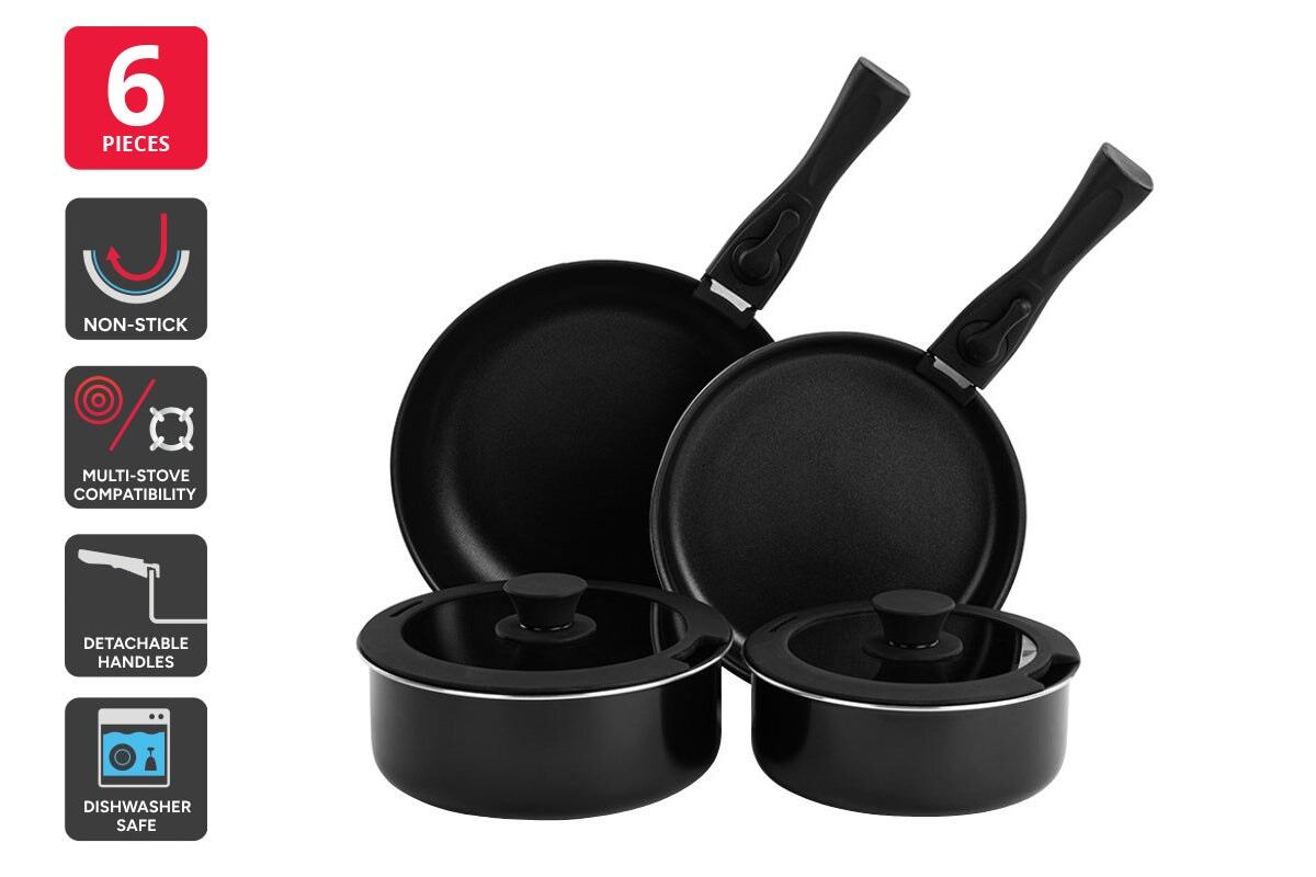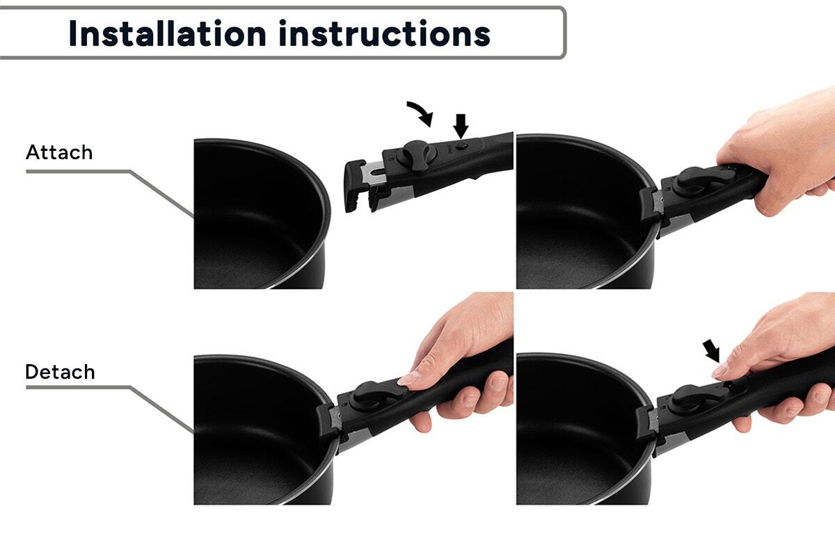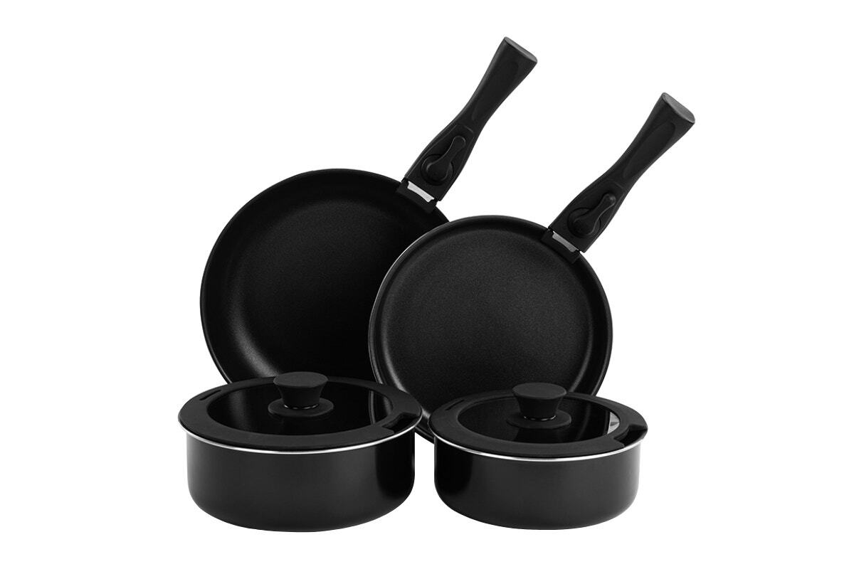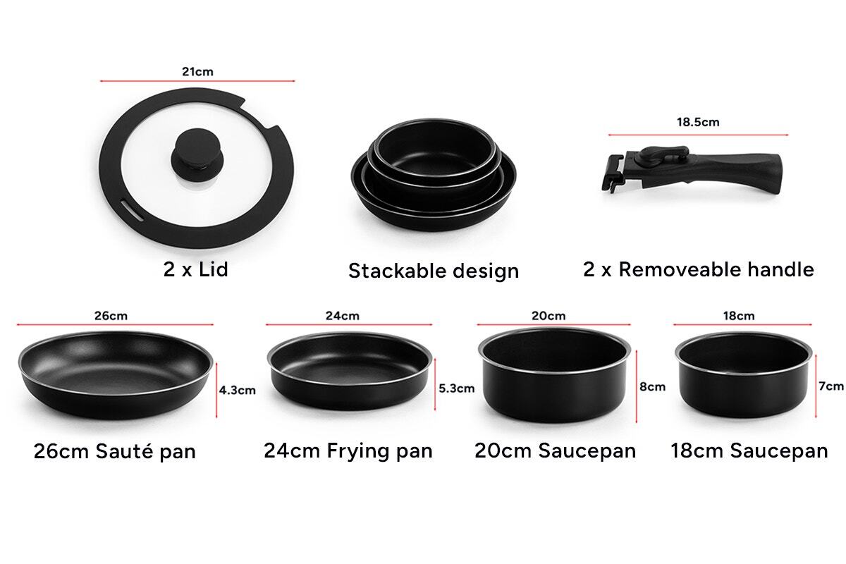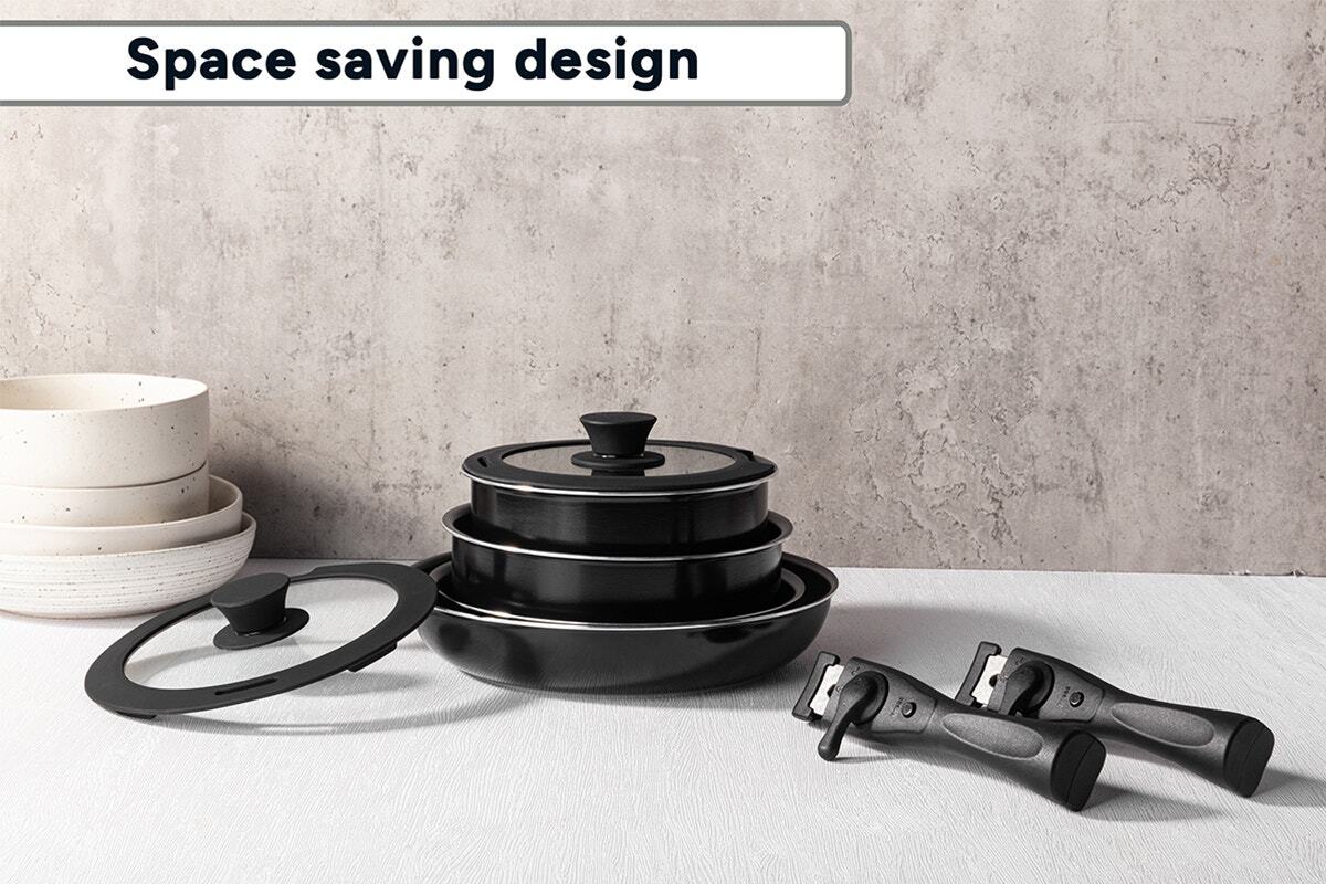 With its sleek, modern design, this cookware set doesn’t just perform; it looks good doing it. The Moderno Cookware Set is designed to complement any kitchen décor, from the ultra-modern to the comfortably traditional, making it a versatile choice for any home. Beyond its aesthetic appeal, the non-stick coating ensures a superior cooking experience, preventing food from sticking and allowing for healthier cooking with less oil. Adding to the convenience are the 2 detachable handles that make stacking and storing your pots easier than ever before.