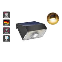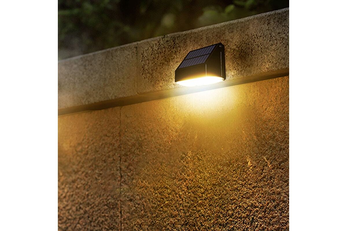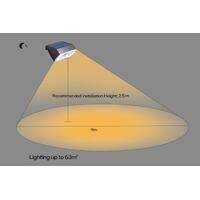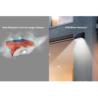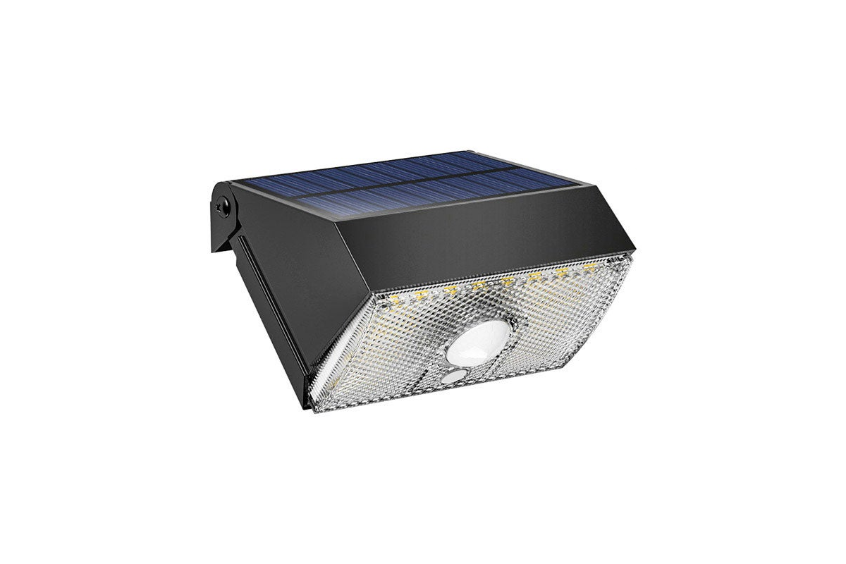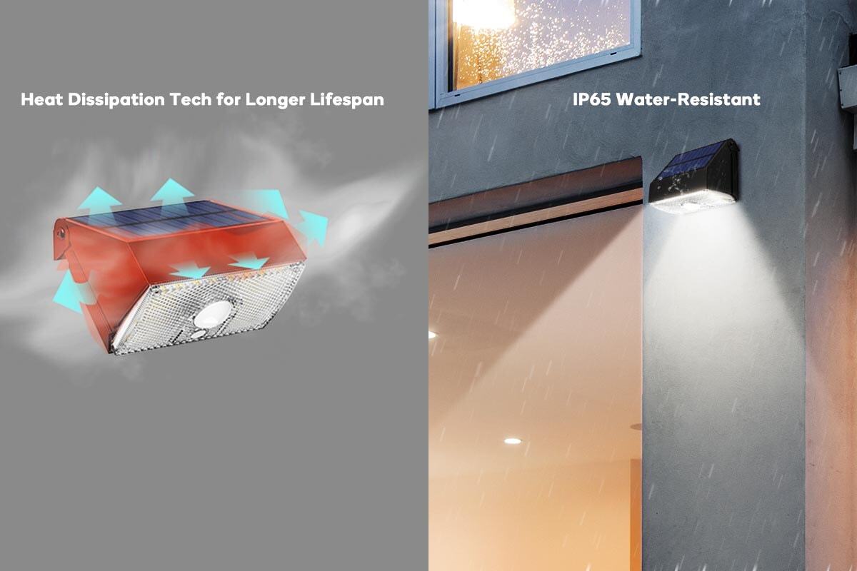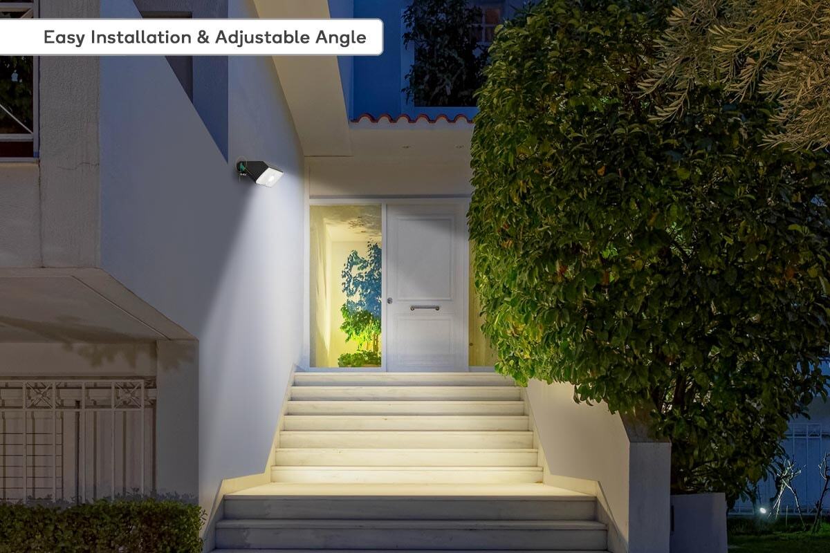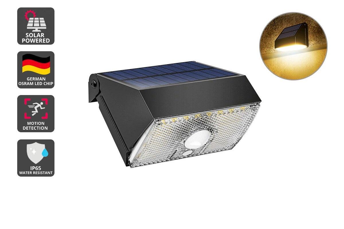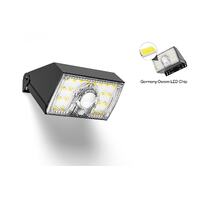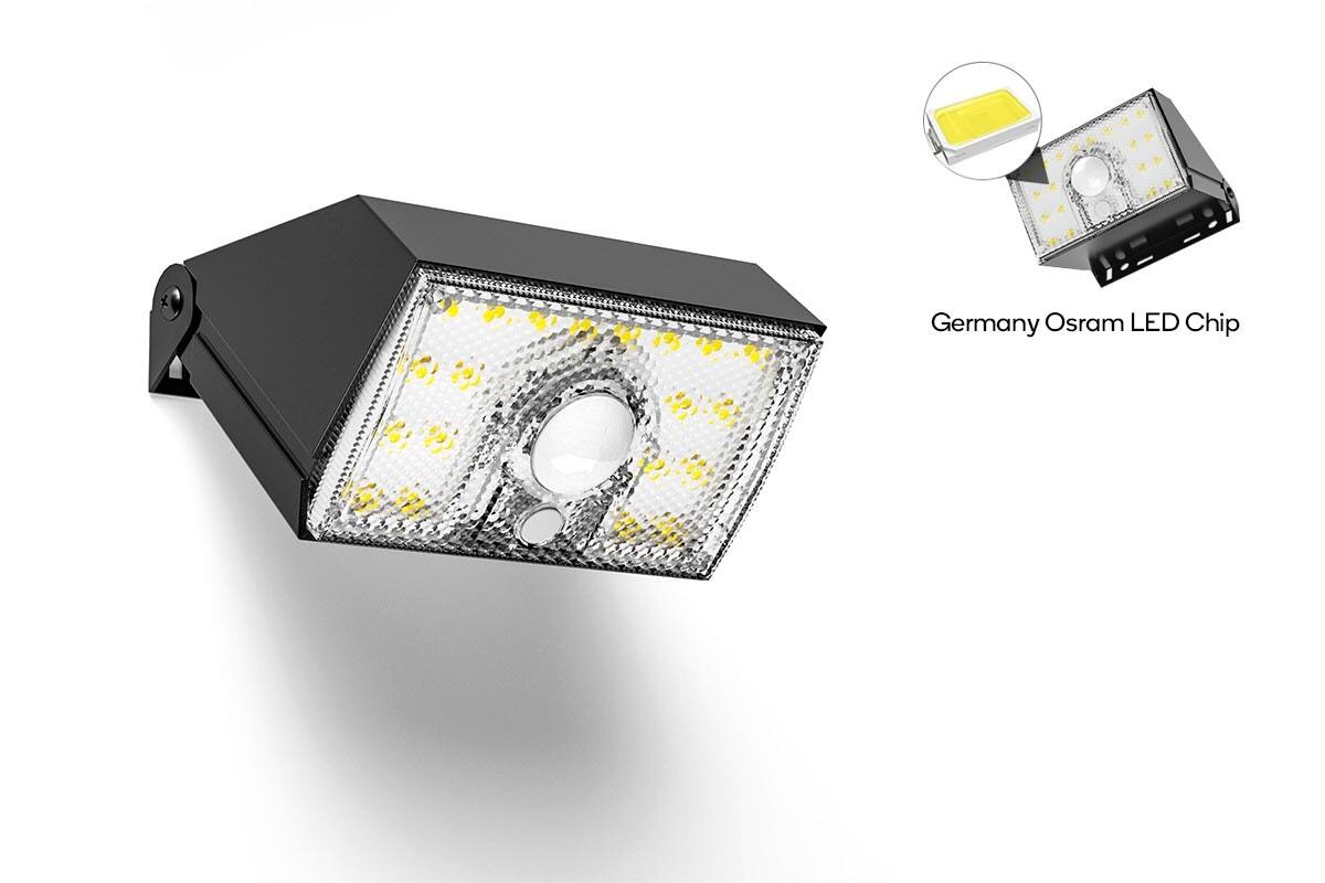 This LED flood light is solar powered and charges during the day. It has a motion sensor that turns the light on when it detects movement. The light is 4000K daylight color temperature. It has a Germany OSRAM LED chip and is IP65-rated water resistant. The light is easy to install and has a long lifespan.