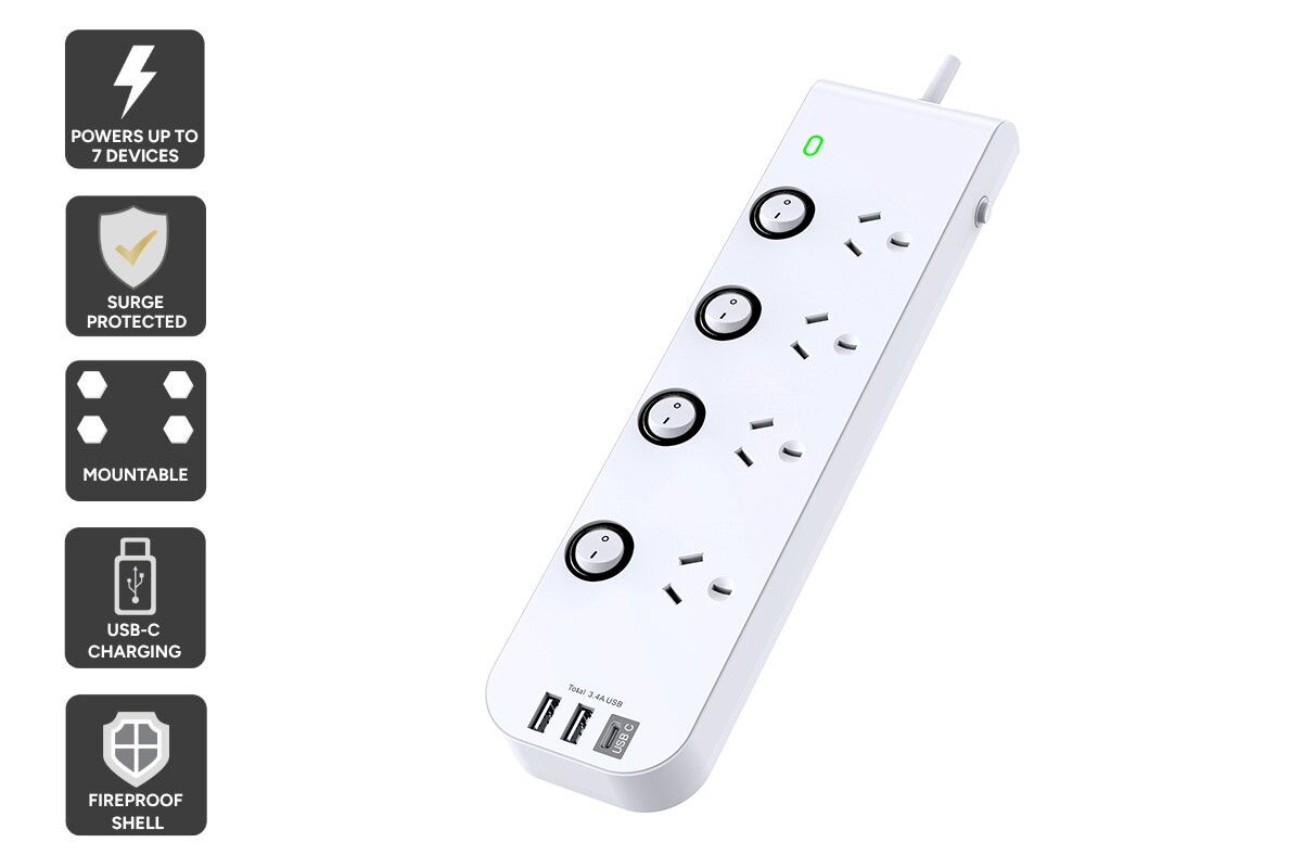Keep your devices powered and protected with the Kogan™ 4-Way Surge Protect Powerboard with 2 USB-A & 1 USB-C Ports, designed for convenient charging and ensured safety.