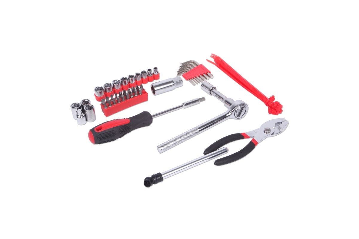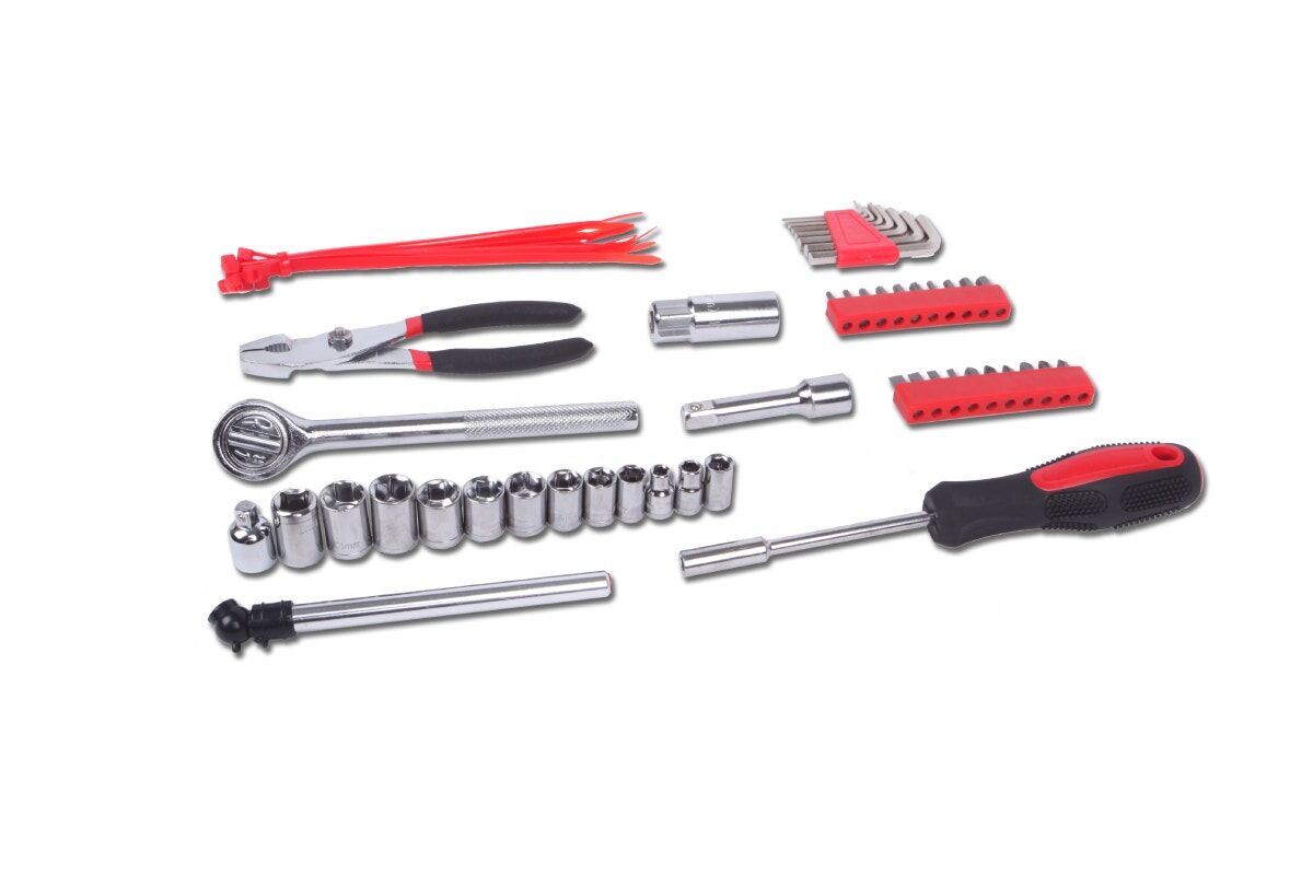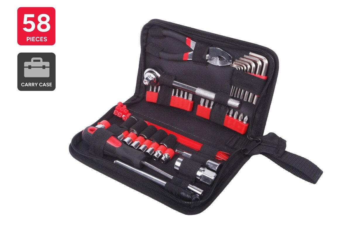 This 58-piece automotive tool kit is your go-to solution for roadside emergencies. This kit includes a wide range of essential tools such as a bit driver with 20 bits, tyre gauge, slip joint pliers, ratchet handle, hex keys, drive sockets and cable ties designed to handle various situations. Each tool is selected to provide comprehensive coverage for most minor repairs and adjustments. This makes the kit an invaluable companion for any driver, offering peace of mind and preparedness on the road.