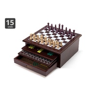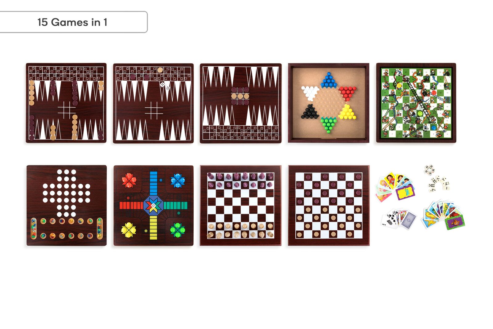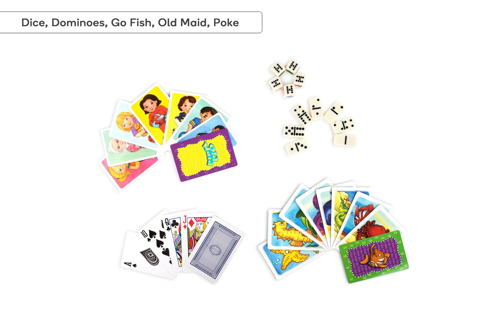 This games table has 15 different games that you can play with friends and family. The four boards included are for chess, Chinese checkers, Aeroplane chess, and Tic Tac Toe. There are also 60 marbles, 33 solitaire disks, 48 Mancala tokens, and 28 dominoes included. The games table also comes with a card pack with instructions for three card games.
