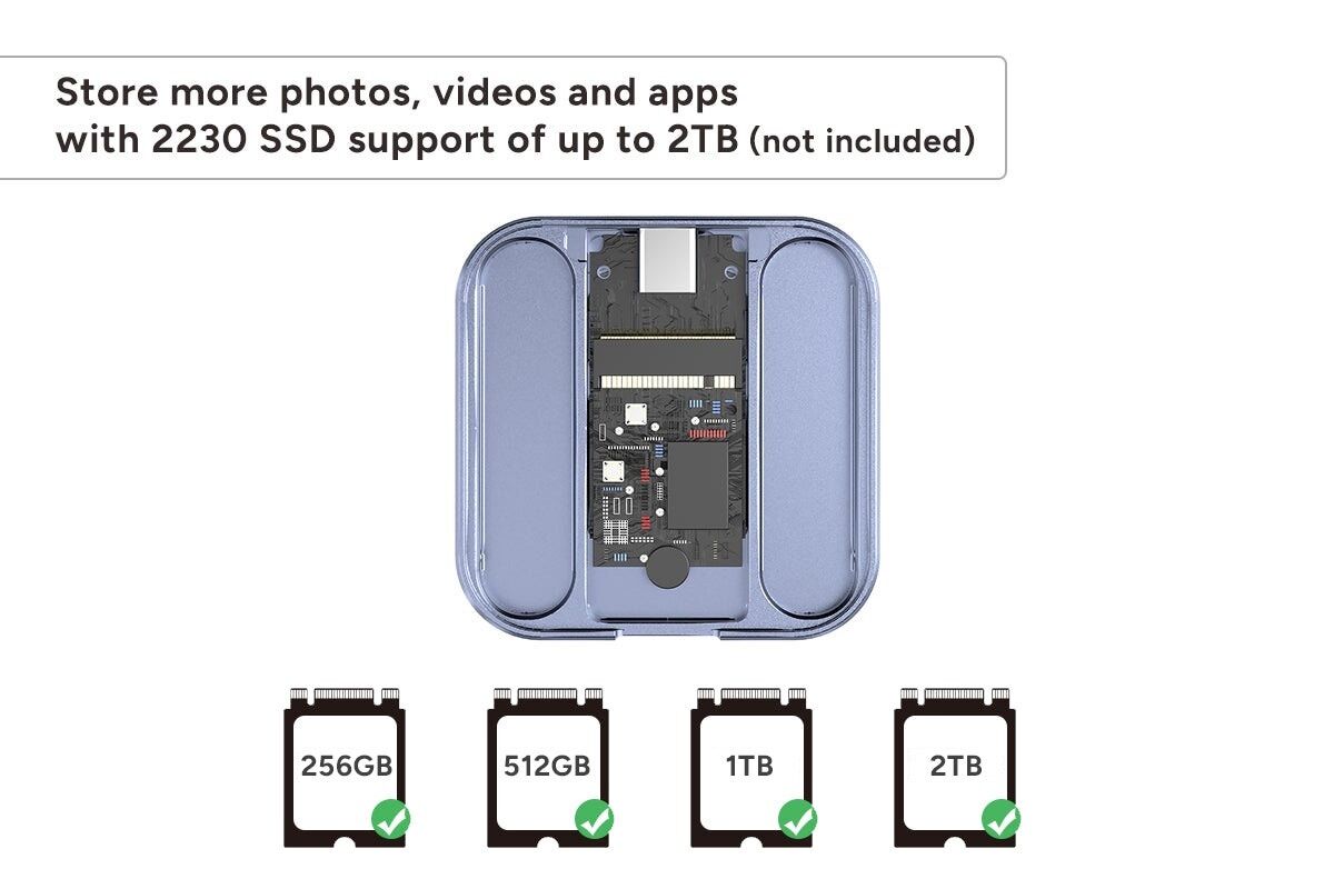 With support for 2230 SSDs up to 2TB, this storage enclosure lets you shoot, save and access hours of cinematic-quality footage without worrying about running out of space. Ideal for creatives who need extensive storage on the go.