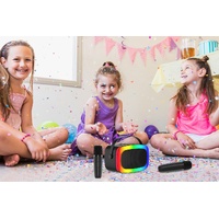 This Mini Karaoke Machine is a compact, portable entertainment system that lets you bring the fun of karaoke to any location with 2 wireless microphones, Bluetooth connectivity and 4 fun vocal effects.