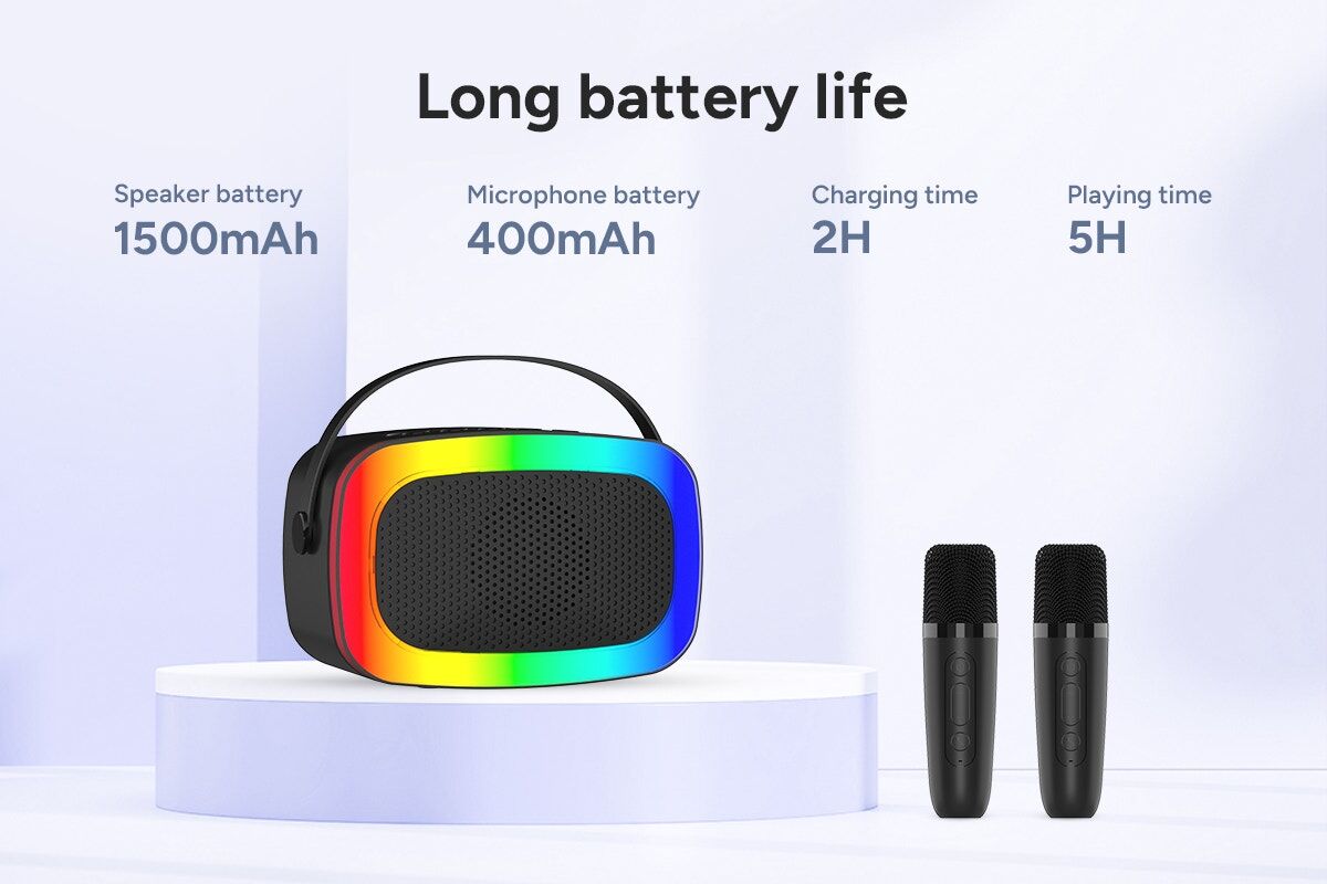 This mini karaoke machine is designed for portability, making it easy to carry anywhere. Despite its compact size, it packs a punch with built-in speakers and two wireless microphones, so you can enjoy karaoke on the go. Whether it’s a party, family gathering or a road trip, this machine brings the fun.