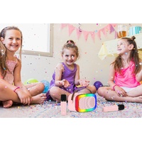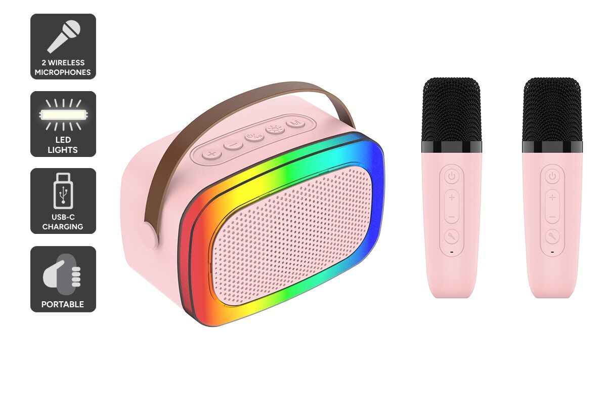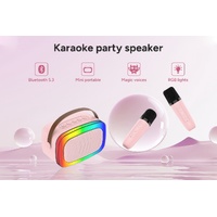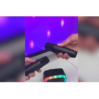 This Mini Karaoke Machine is a compact, portable entertainment system that lets you bring the fun of karaoke to any location with 2 wireless microphones, Bluetooth connectivity and 4 fun vocal effects.