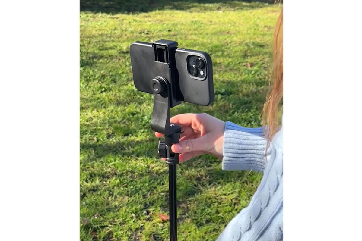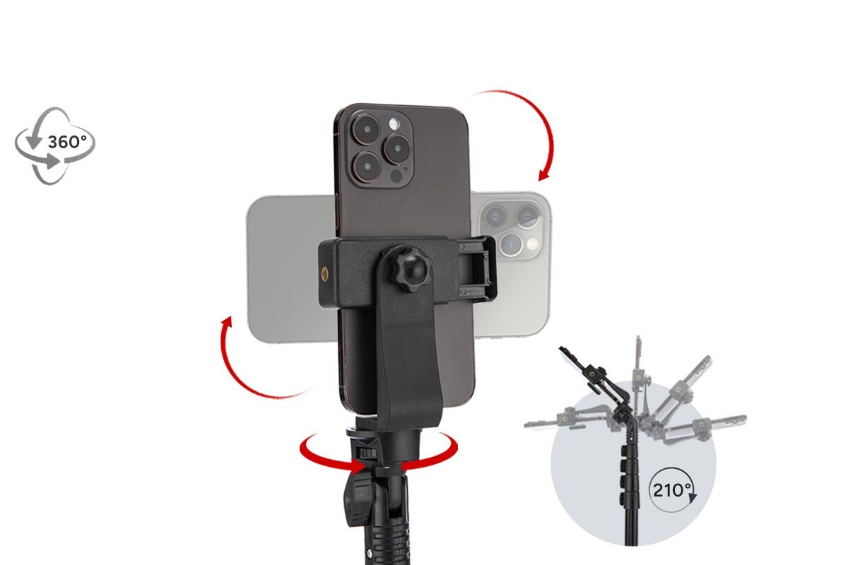 - Rotatable and secure phone holder. Shoot in landscape or portrait modes.