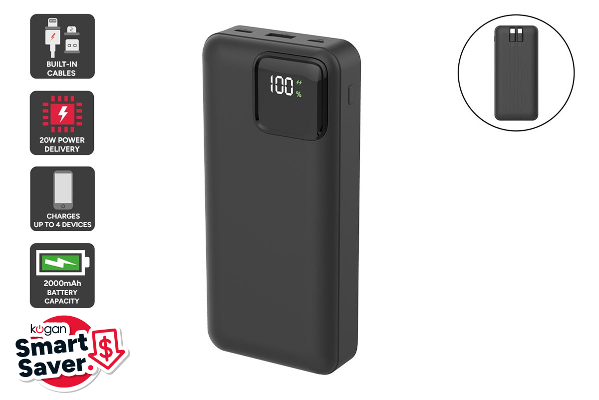 Power up anytime, anywhere with the Kogan 20000mAh 20W PD Power Bank. With built-in USB-C and Lightning cables and the capacity to charge multiple devices simultaneously, this power bank is designed to keep you connected and powered up on the go.