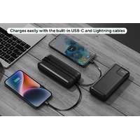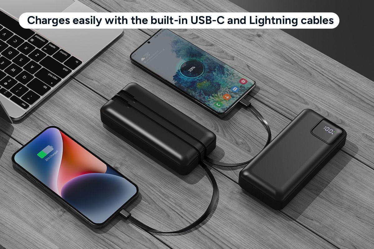Say goodbye to tangled cords! With USB-C and Lightning cables built right in, this power bank is ready for your devices. Compatible with most iPhones and Androids, it’s the ultimate all-in-one power solution for anyone on the go.