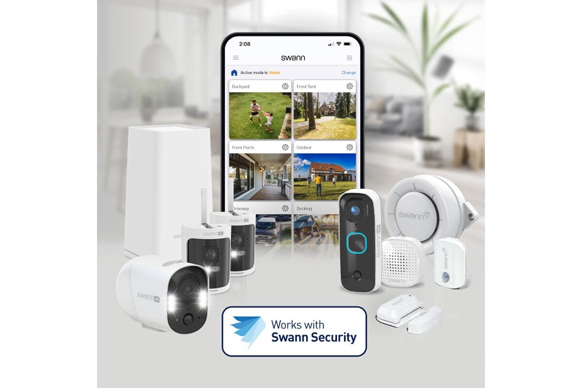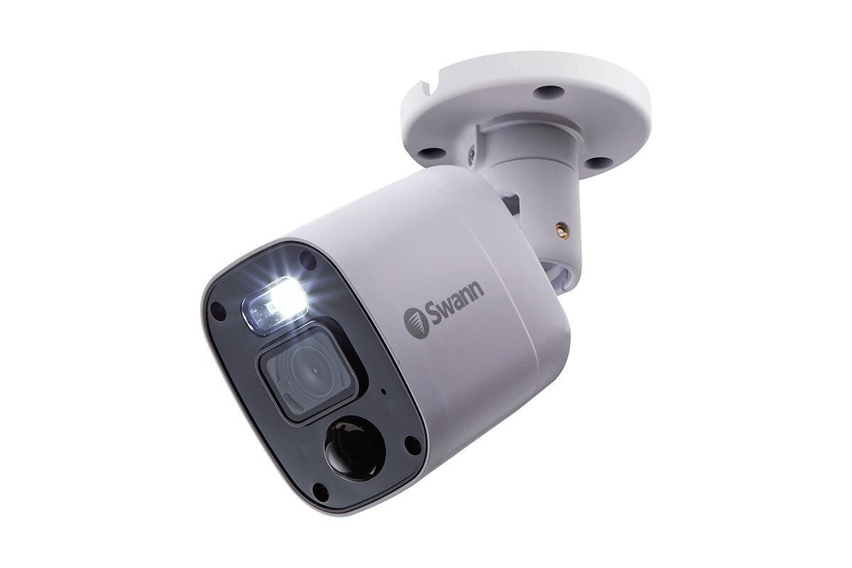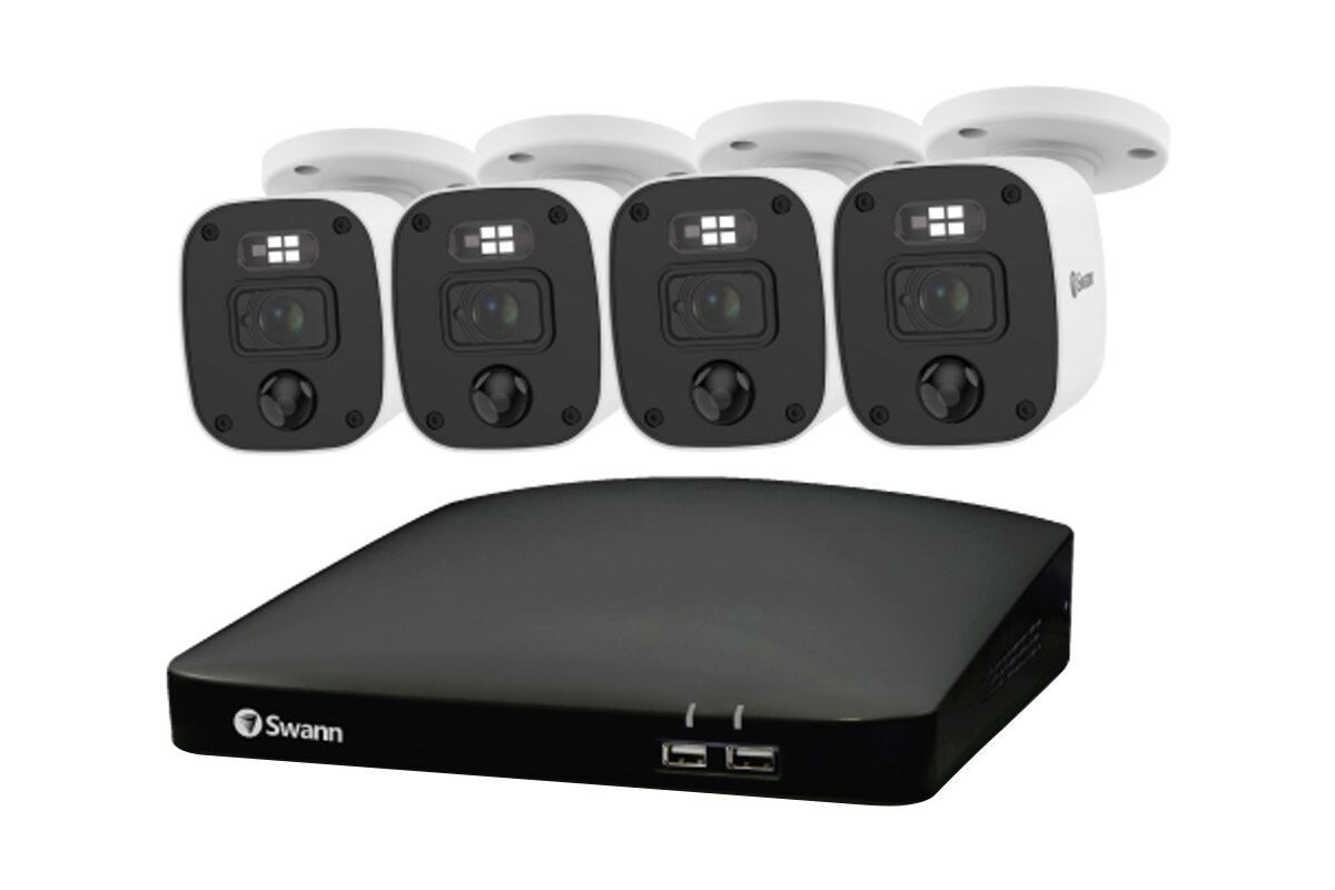 The Swann Home 8 Channel 2K DVR Security System offers crisp 2K video, sensor spotlights and red and blue deterrent lights for enhanced security with audio recording.