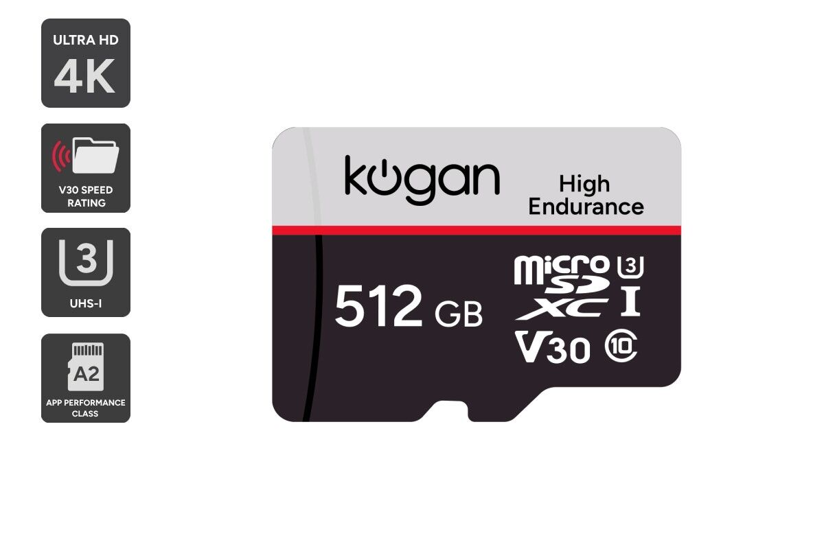 Store more, capture every detail and experience high-speed performance with the Kogan™ High Endurance 512GB Micro SD Card. Designed for continuous, high-demand tasks, this SDXC card is perfect for security, dash and body cameras, and more.