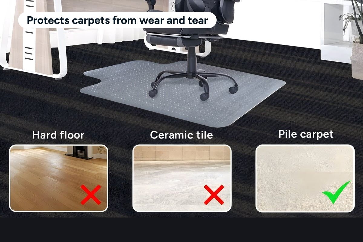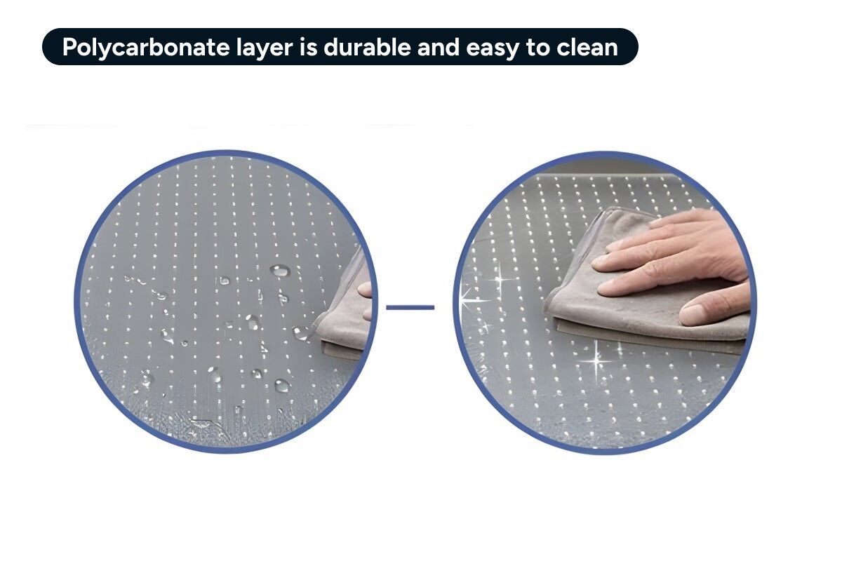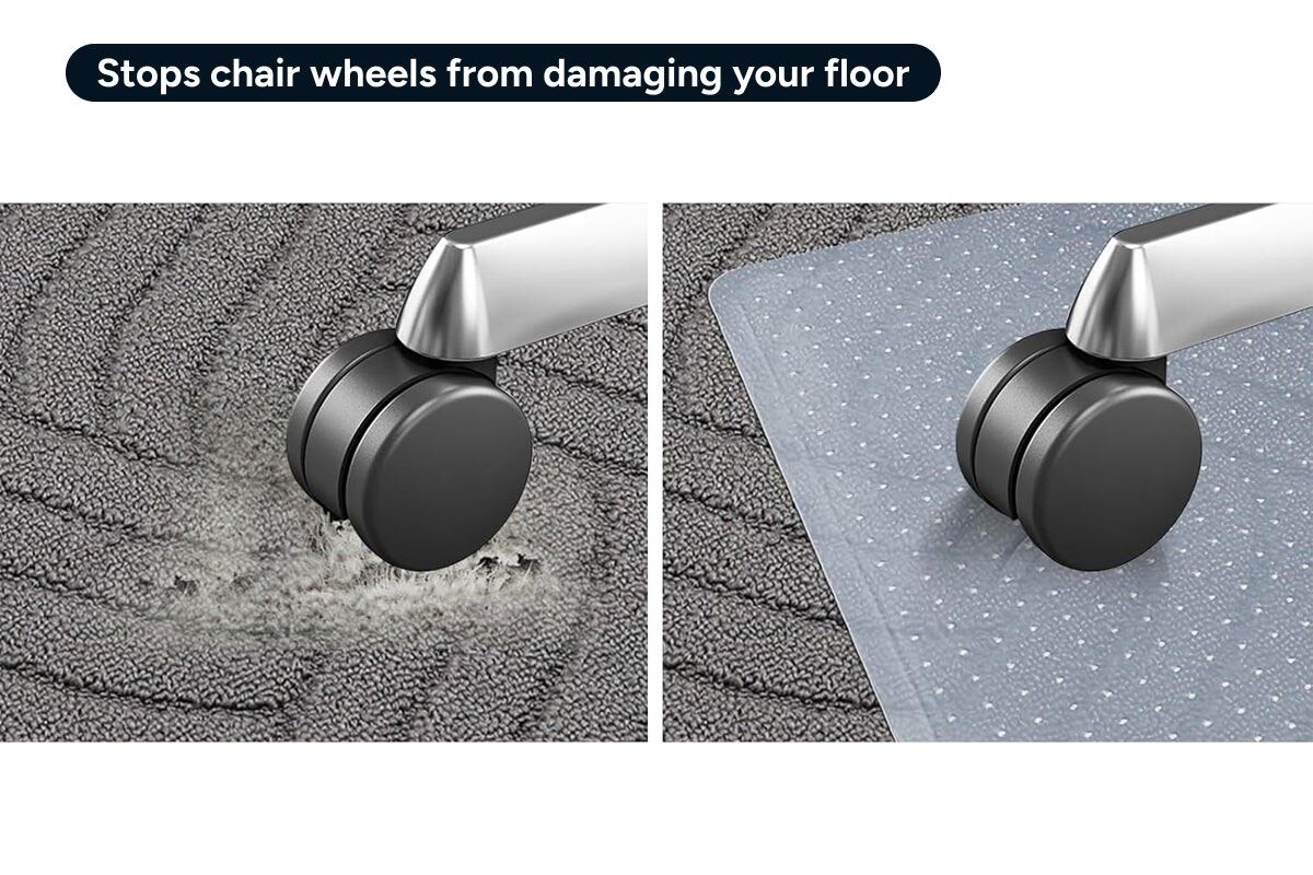The strong polycarbonate layer acts as a protective shield against indentations, scuffs and friction caused by chair wheels. Perfect for preserving the condition of your workspace carpet.