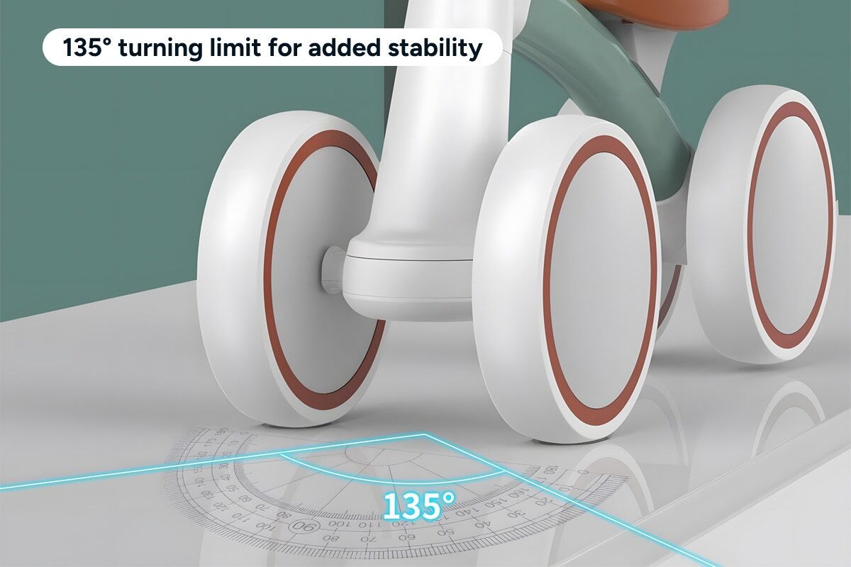 The enclosed wheels and 135° turning limit help prevent tipping and foot injuries, giving parents peace of mind while little riders explore safely.