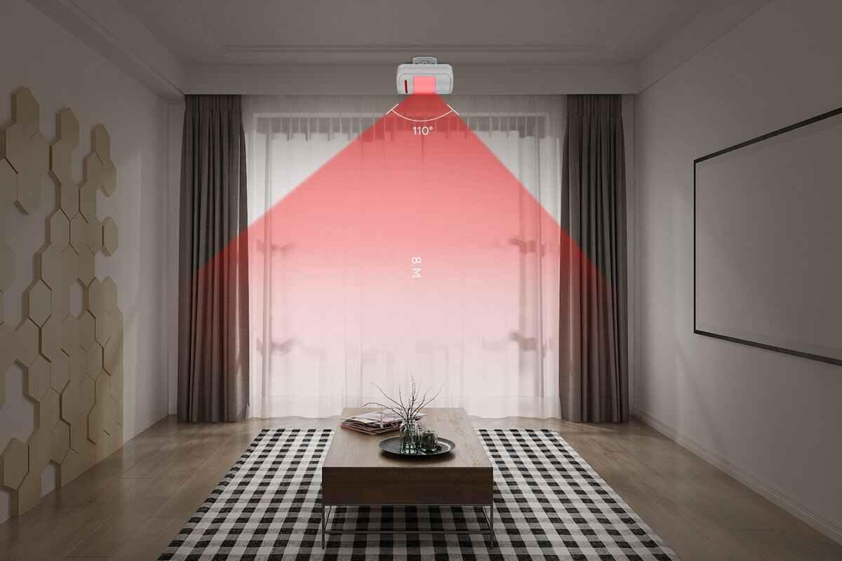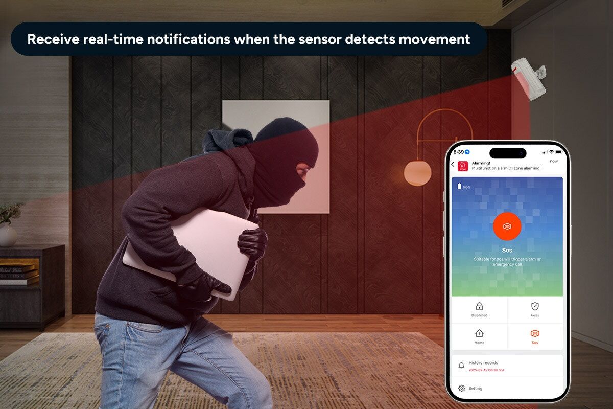 Featuring an 8m detection range and a broad 110° angle, this sensor monitors expansive areas effectively. Whether placed in hallways, entry points or large rooms, it ensures thorough coverage. Plus, its 100m transmission range keeps it connected and responsive across your property.
