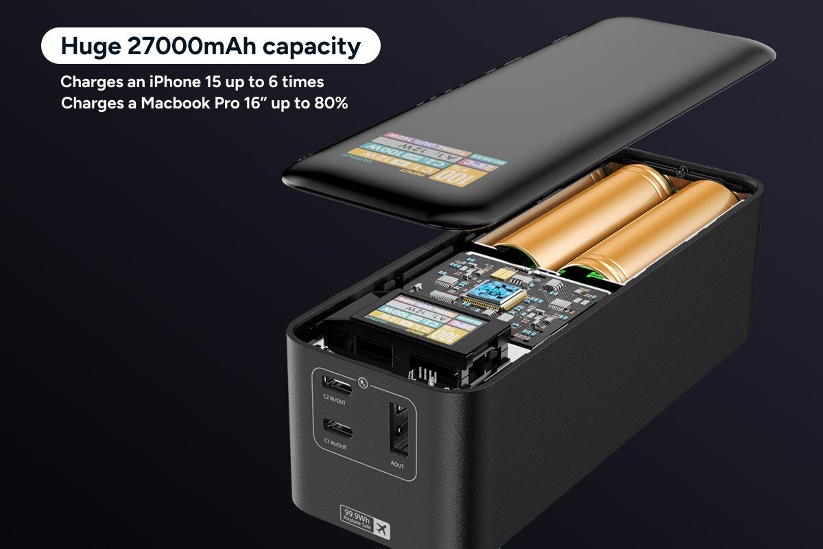 - 27000mAh capacity. Delivers extended power for laptops, phones and more.