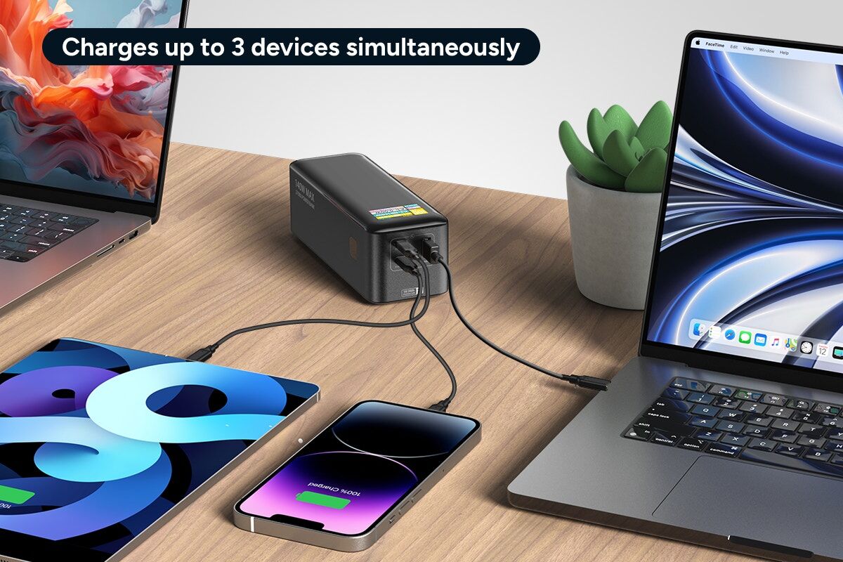 - 3-device charging. Power multiple devices at once via 2 USB-C and 1 USB-A port.