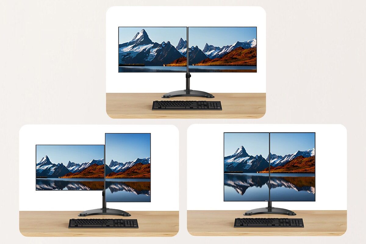 The free +45° ~ -45° tilting design and 360° rotation provide unparalleled flexibility, allowing you to adjust your screens to reduce glare and achieve the perfect angle for every task. Transition effortlessly between portrait and landscape modes to suit your workflow.