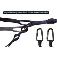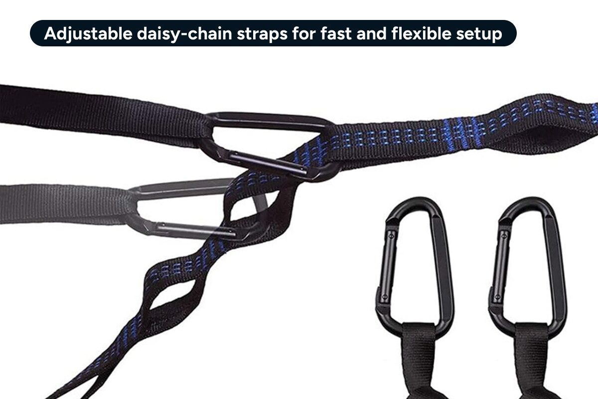 • Strong straps and carabiners. Easy setup and secure anchoring in minutes.