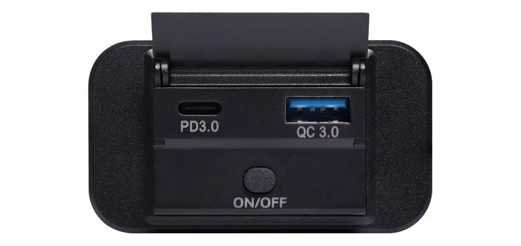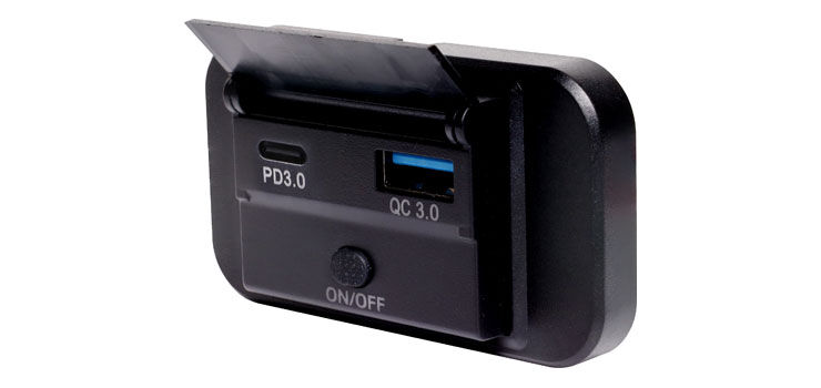 A compact panel mount charging socket providing 18W USB type C power delivery charging and QC3.0 USB type A charging. Simply connects to any 12-24V DC power source using the flylead connections on rear. Fitted with dustproof cover which flips up to provide access to USB charging ports. USB charging functionality can be manually turned on and off using the from panel button to prevent standby power loss.