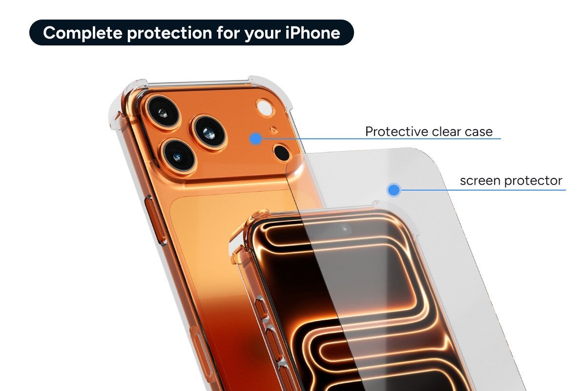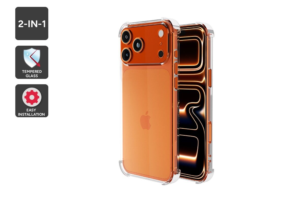 Give your iPhone 17 Pro Max complete, everyday defence with this 2-in-1 Protection Kit, combining a slim, shock-absorbing clear case with a crystal-clear tempered glass screen protector for reliable all-round coverage without compromising style.