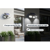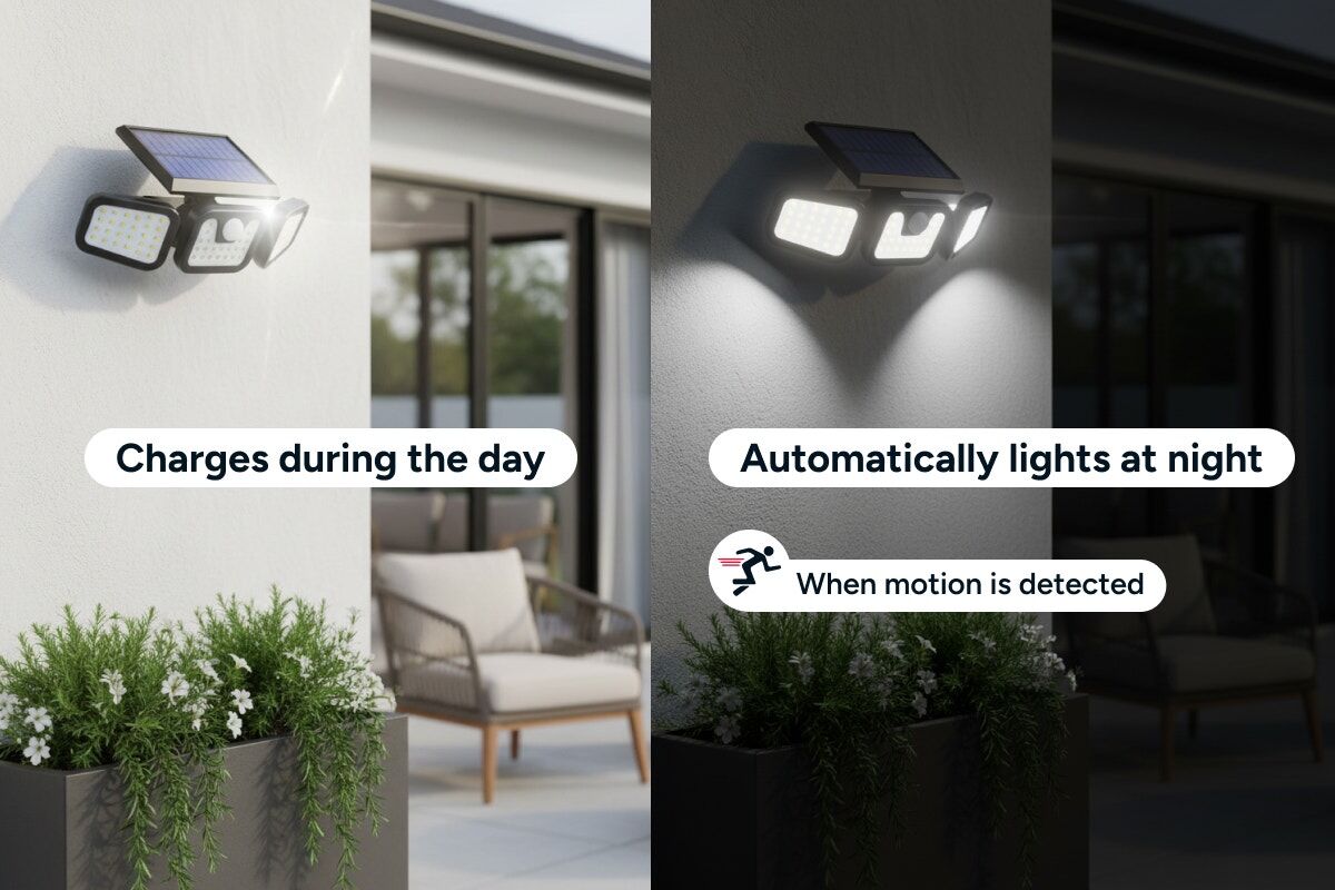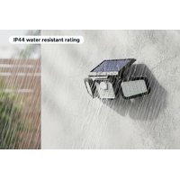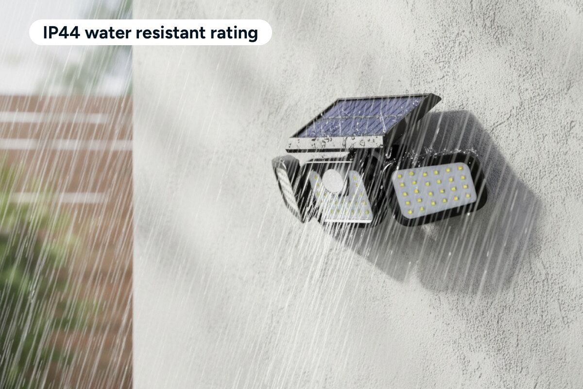 up to 10m distanceThis light is powered by the sun and has a rechargeable battery. It is waterproof and has 3 rotatable heads for better visibility. The PIR sensor can detect motion up to 10m away.