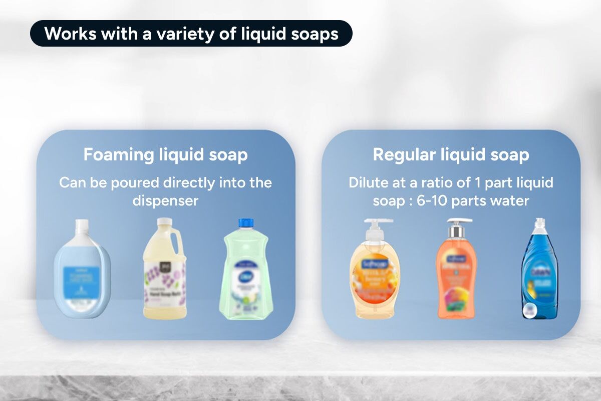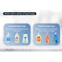 Designed for both foaming soap and liquid soaps, this dispenser saves money by reducing waste. Simply mix regular liquid soap with water at a 1:6–10 ratio and enjoy rich foam that’s effective, gentle and long-lasting.