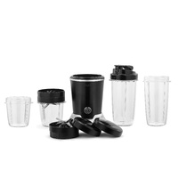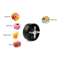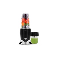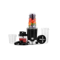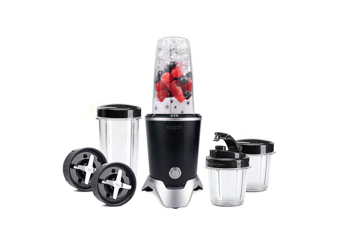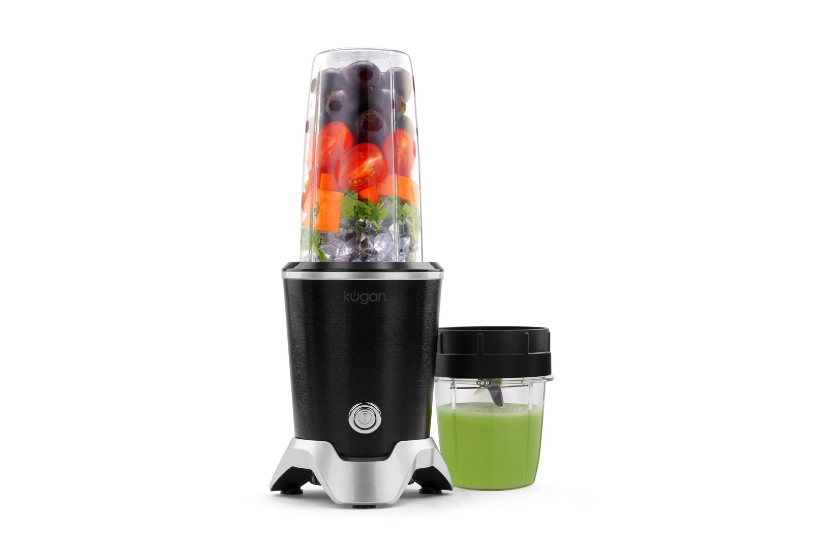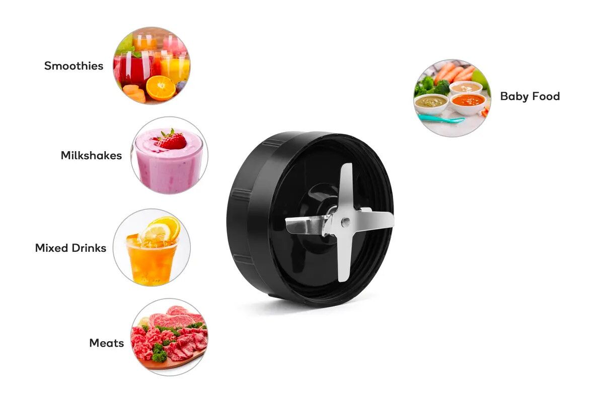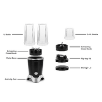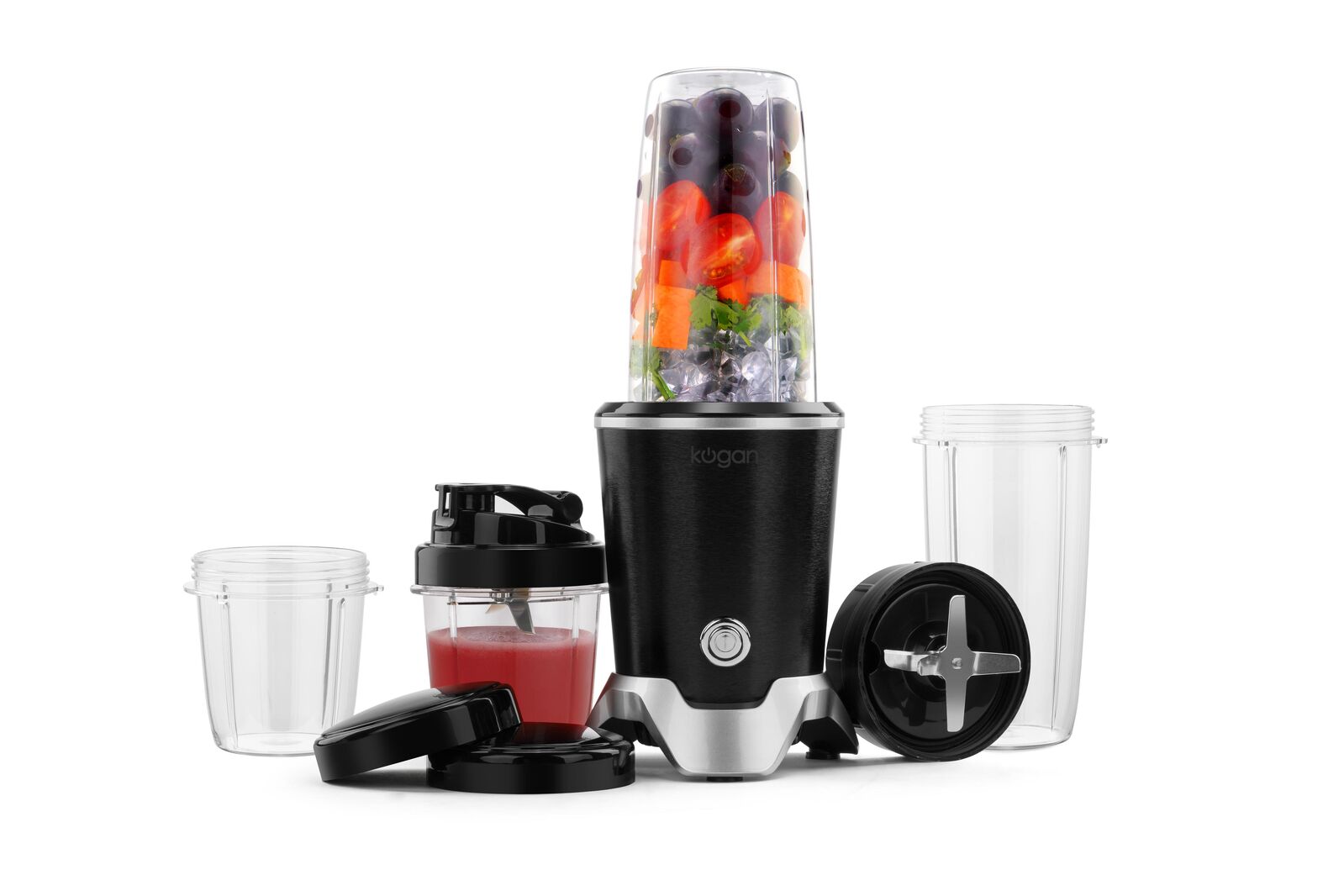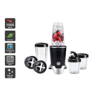 This blender has 1000 watts of power, which lets you blend ingredients quickly and easily. The set includes 2 tall cups, 2 short cups, 2 extractor blades, 1 flip-top to-go lid, and 2 stay-fresh resealable lids. The interlock system prevents the blender from turning on if not all parts are locked in correctly. The rubber feet keep the blender stable while in use. The set is BPA-free and dishwasher safe. A recipe book is included.