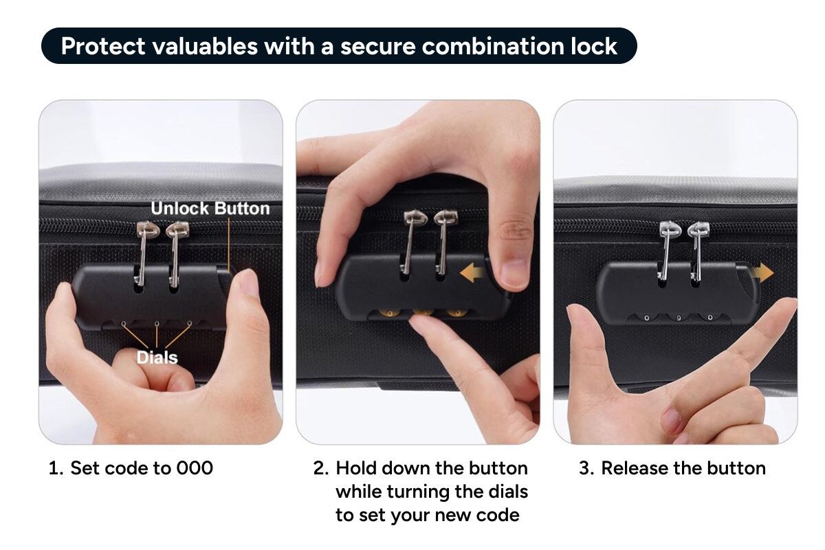 - Password lock security. Protects sensitive files and valuables with a secure combination lock.