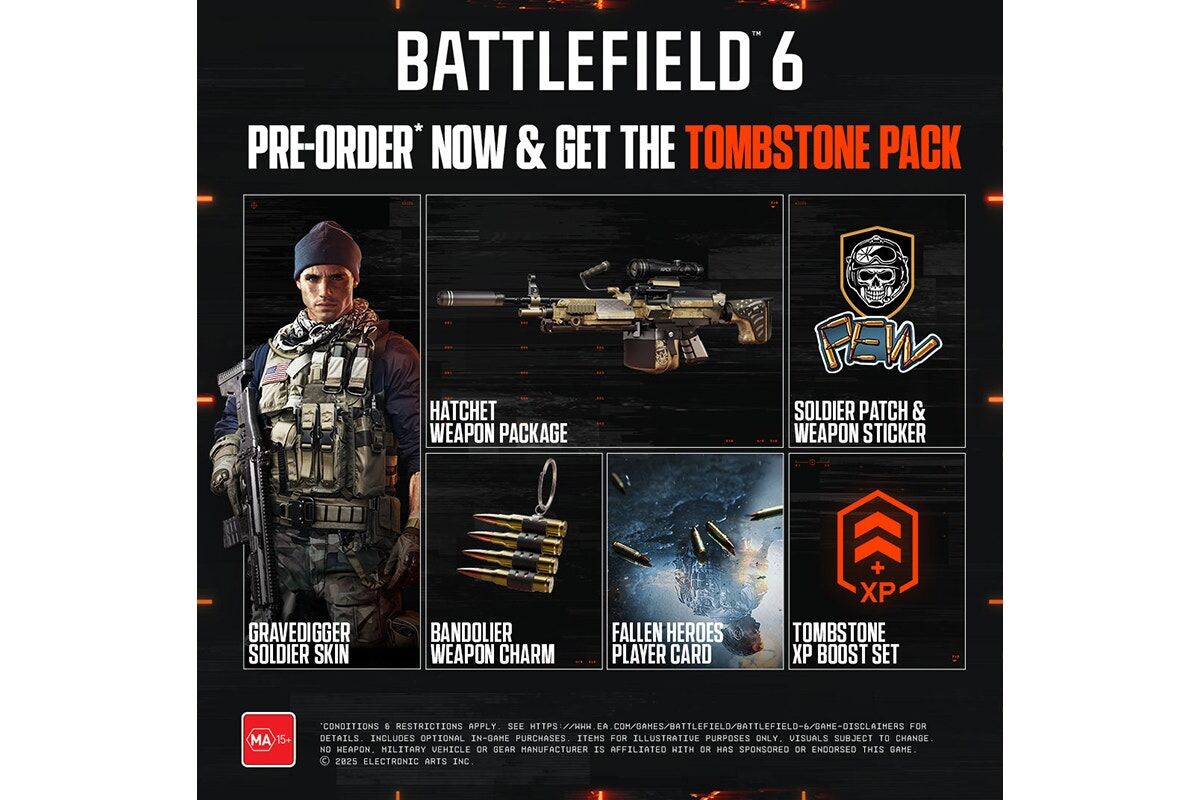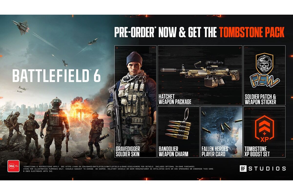 Pre-order before October 10, 2025, for the Gravedigger Soldier Skin, “Fallen Heroes” Player Card, “Bandolier” Weapon Charm, “Express Delivery” Weapon Sticker, “Hatchet” L110 Weapon Package, “Doomsayer” Soldier Patch, and the Tombstone XP Boost Set, including 60 min Career XP Boost and 60 min Hardware XP Boost.