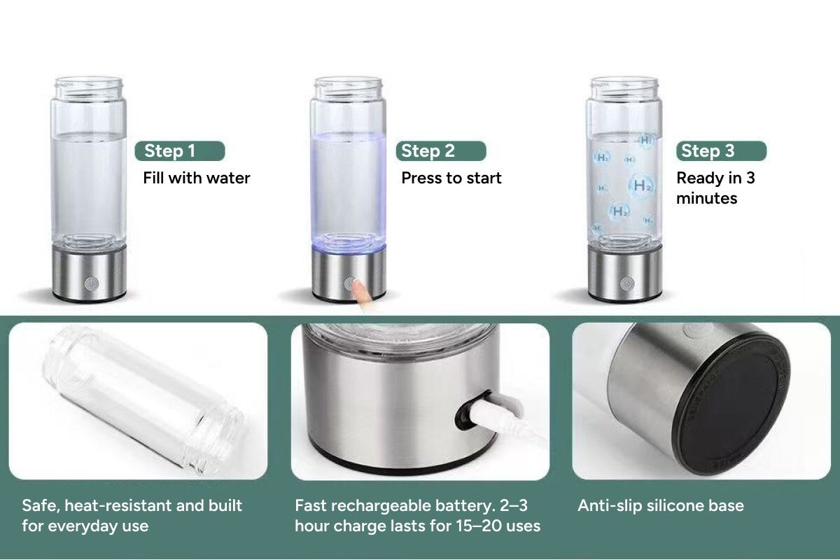 Stay hydrated and refreshed with the Portable Hydrogen Water Bottle (420ml). In just 3 minutes, this sleek portable device produces hydrogen-rich water that’s cleaner, fresher and packed with potential health benefits, wherever you go.