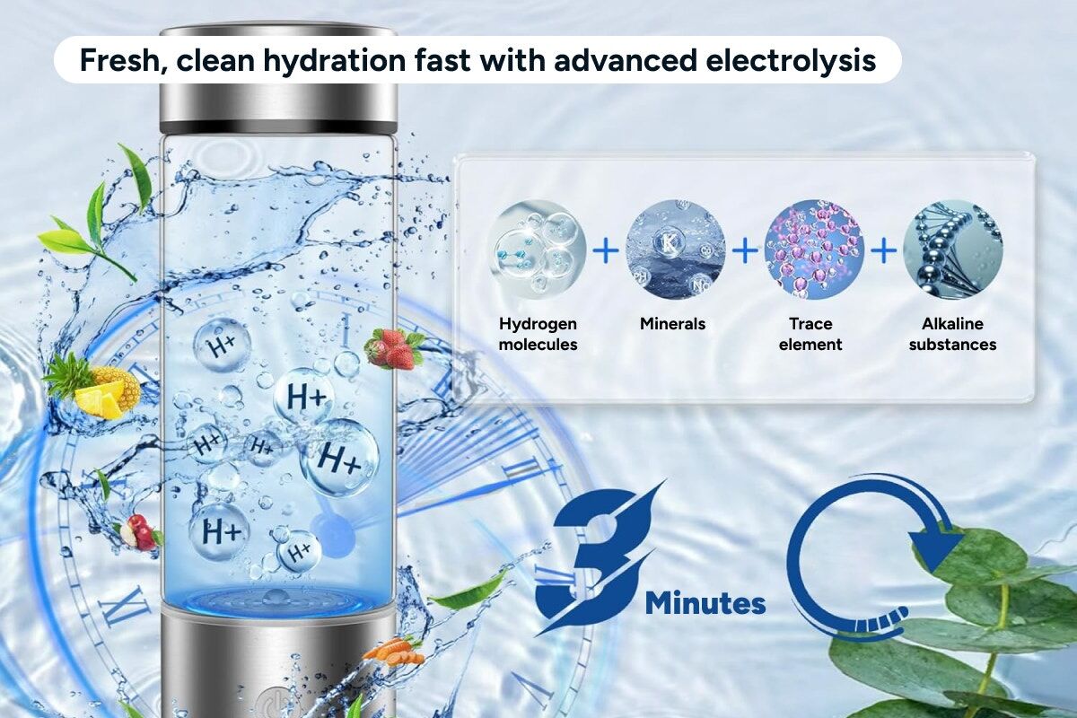 Using advanced electrolysis, the bottle infuses your water with hydrogen in just 3 minutes, while removing residual chlorine and ozone for a cleaner, fresher taste. Simply fill, press the button and enjoy hydrogen-rich hydration at home, work or on the go.