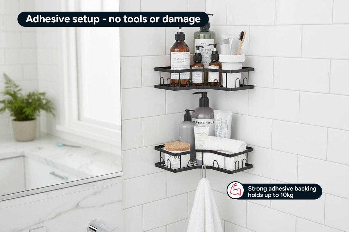 Maximise your bathroom space with the Adhesive Corner Shower Caddy (2 Pack) – a sleek, no-drill solution that keeps your essentials organised while adding a refined, modern touch to your shower.