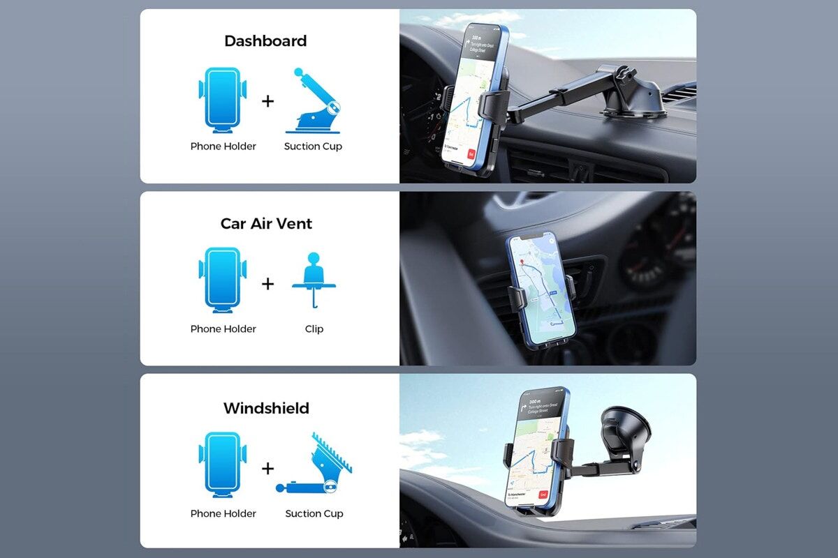 - 2-in-1 versatile mounting. Suction cup mount and air vent mount.