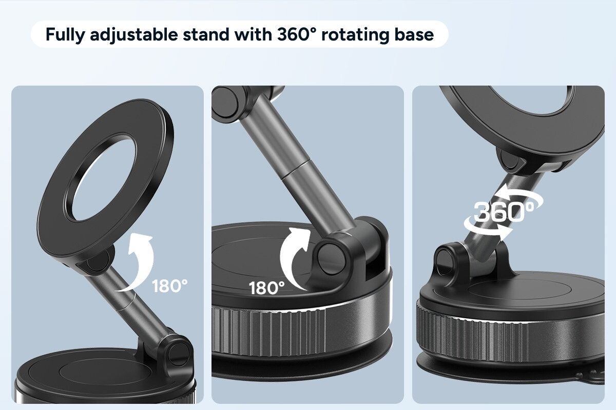 Use your phone hands-free while driving with confidence using this MagSafe Compatible Rotatable Vacuum Car Phone Holder. With strong suction, a 360° rotating base and fully adjustable angles, this sleek mount keeps your phone secure and visible for safer, smarter driving.