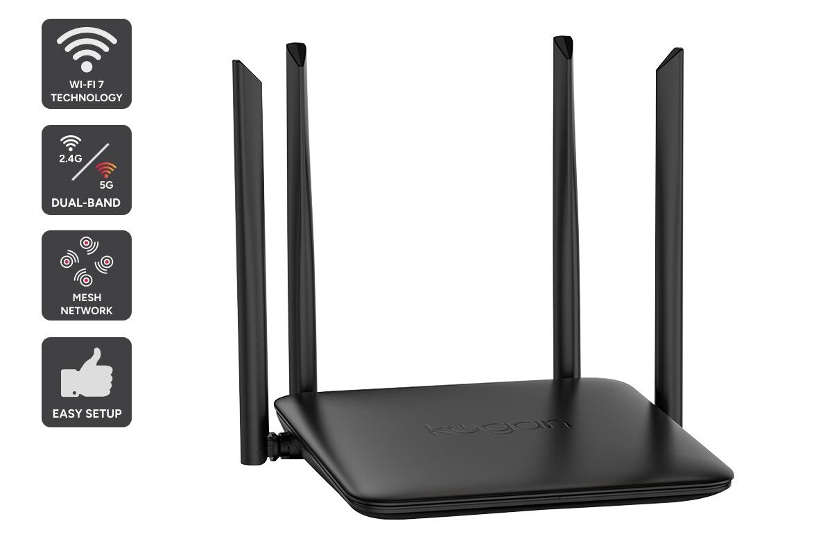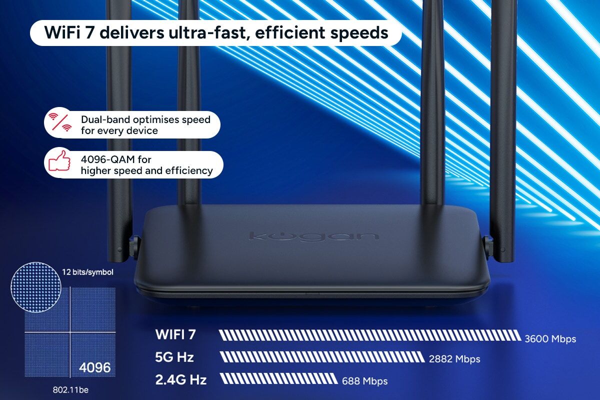 Unlock faster, smoother and more reliable home Wi-Fi with the Kogan dual-band Wi-Fi 7 router with mesh function. Built for next-generation performance, it delivers strong, stable coverage for streaming, gaming and everyday connectivity.
