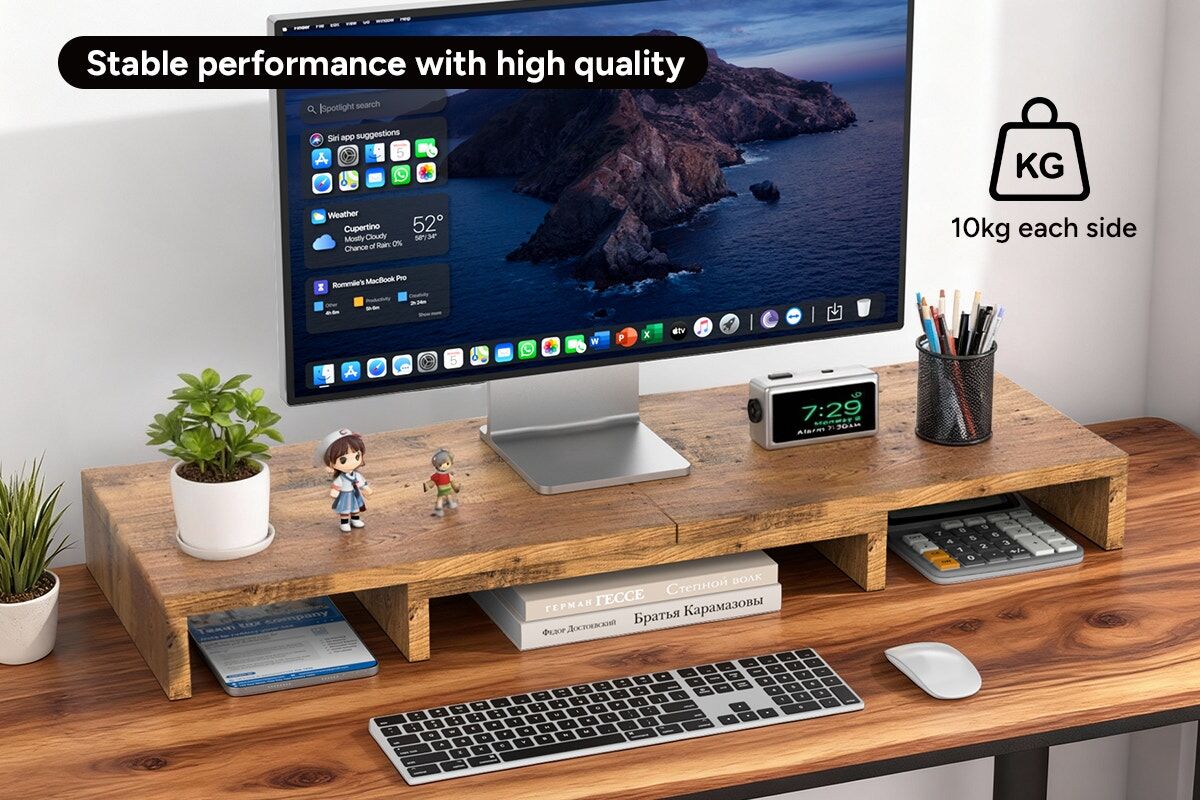 Made from durable MDF, this stand supports up to 10kg on each side. Its clean, modern design blends seamlessly into any workspace while giving you the sturdiness you need.