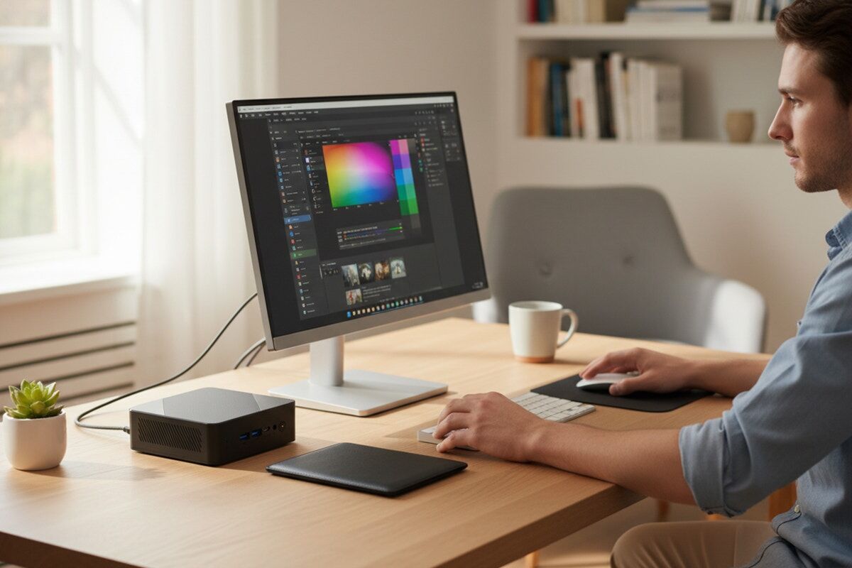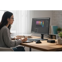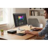 The compact case keeps your desk tidy while offering reliable airflow through discreet side vents. Whether it’s tucked behind a monitor or sitting on your desktop, it blends into any workspace.