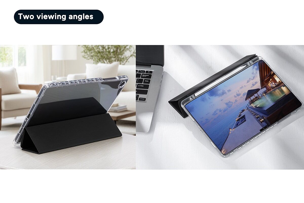 - Tri-fold stand design. Supports two stable viewing angles for comfortable typing or hands-free viewing.