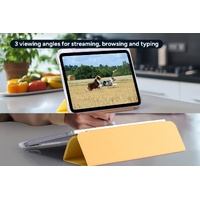 • Tri-fold stand design. Three stable viewing angles for typing, streaming, and browsing.