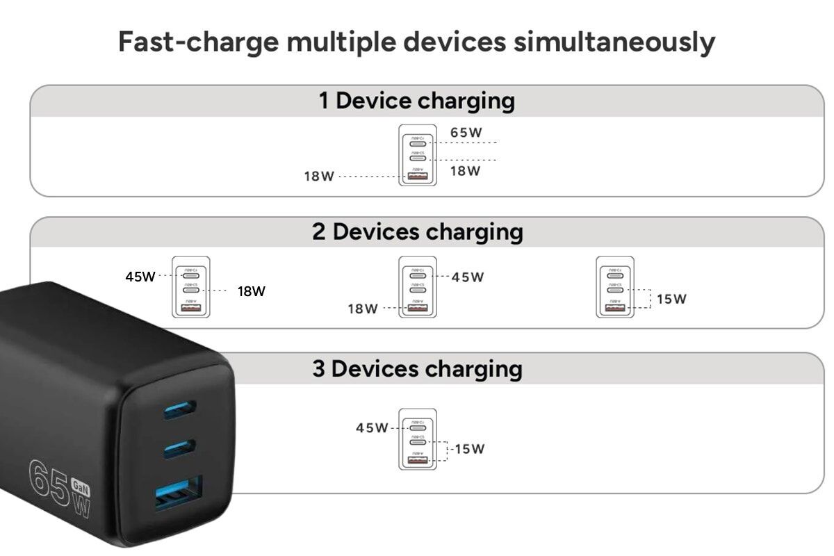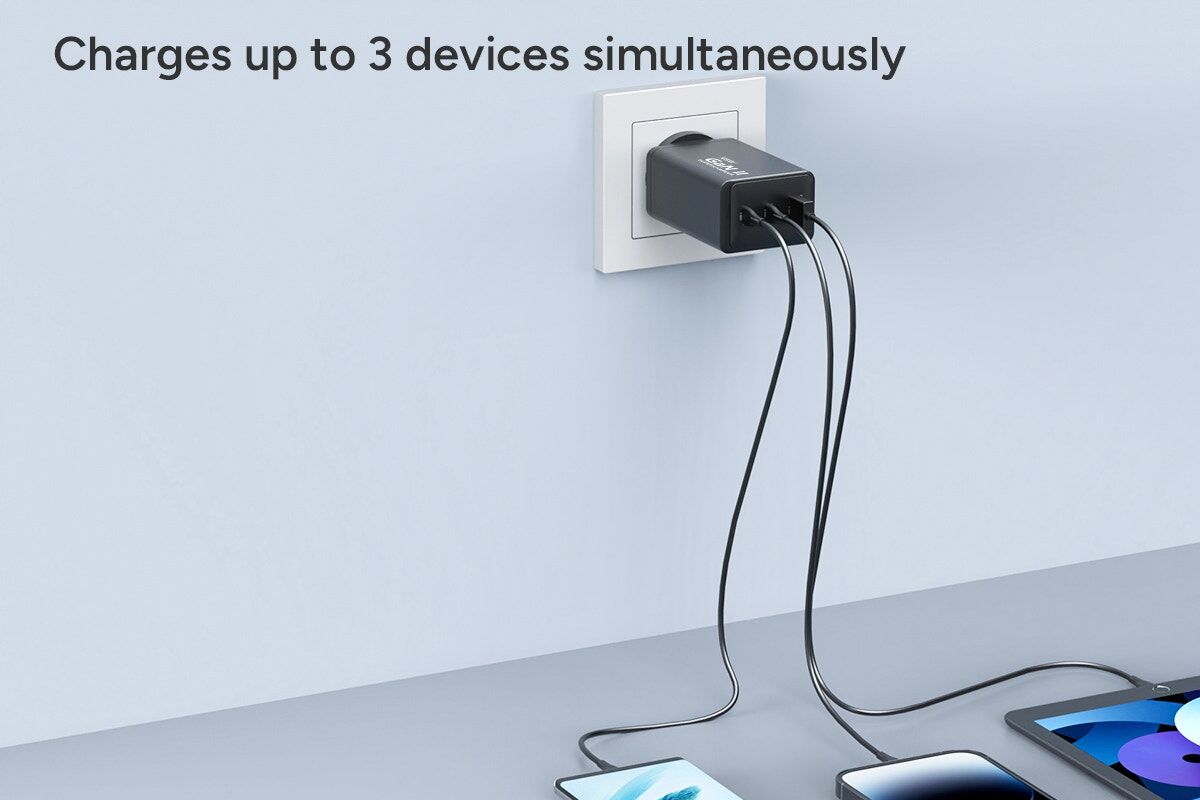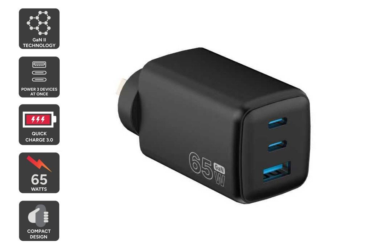 Power up faster with the Kogan 65W 3-Port GaN Super Fast PD Phone Charger, delivering high-speed charging in a compact, travel-friendly design. Charge multiple devices at once without the bulk of traditional chargers.