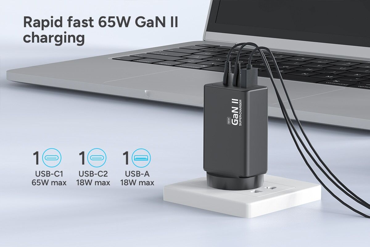 Gallium nitride technology allows this charger to deliver powerful 65W output while staying smaller and cooler than standard chargers. It’s efficient, reliable and built for modern fast-charging needs.