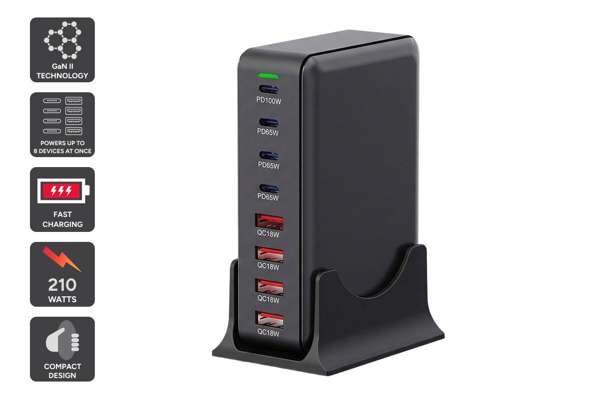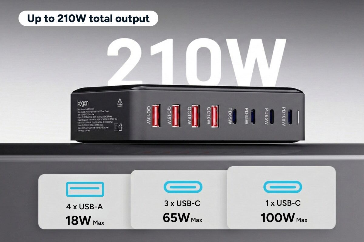 Power all your devices lightning fast with the compact, high-performance Kogan™ 210W 8-Port GaN PD Super Fast Charging Station.