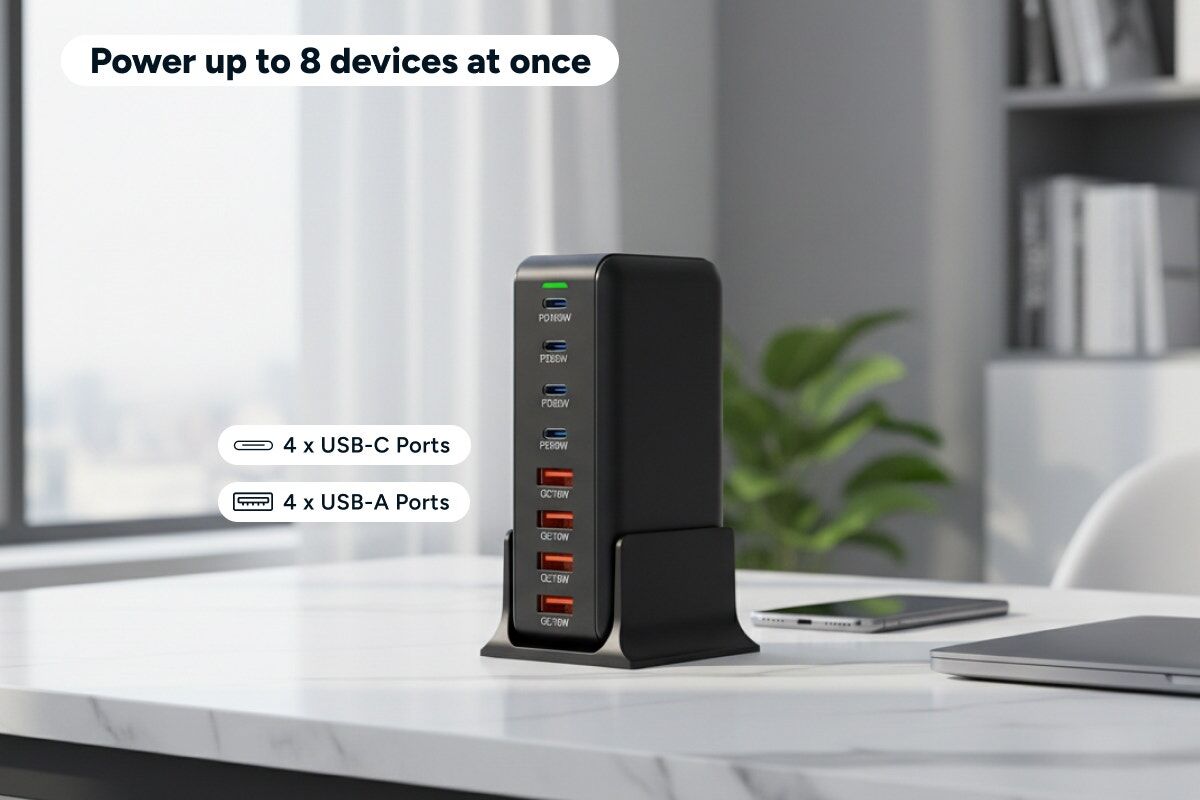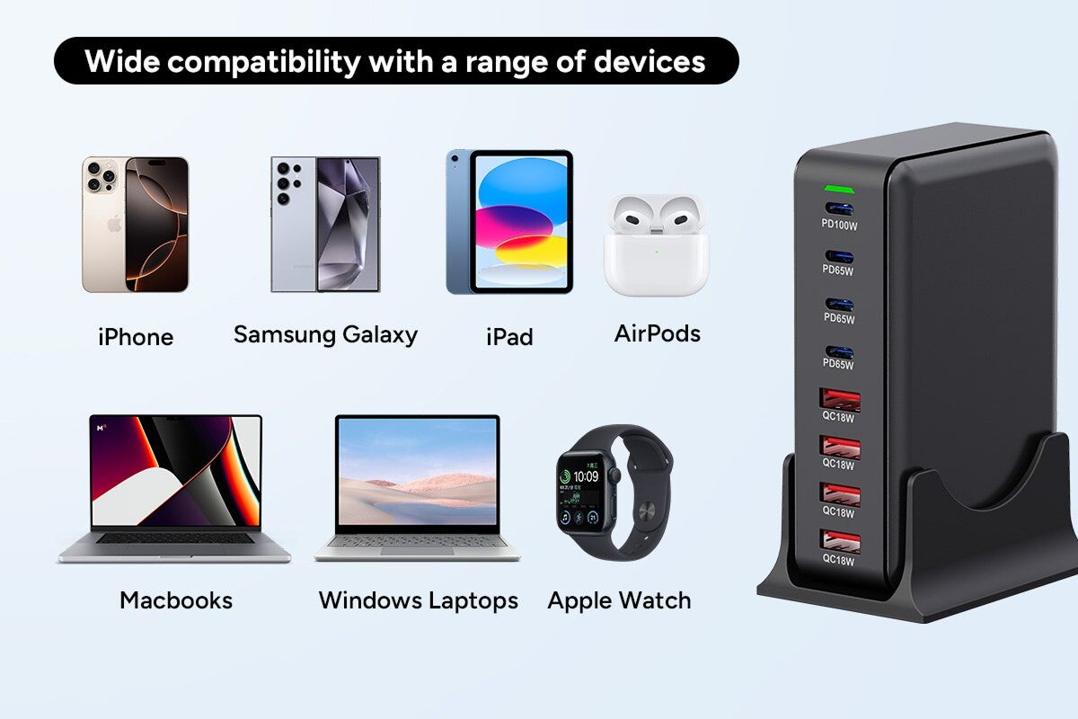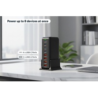 4 USB-C and 4 USB-A ports let you charge up to 8 devices at once, making it ideal for home offices or as a powerful portable charging solution when travelling.